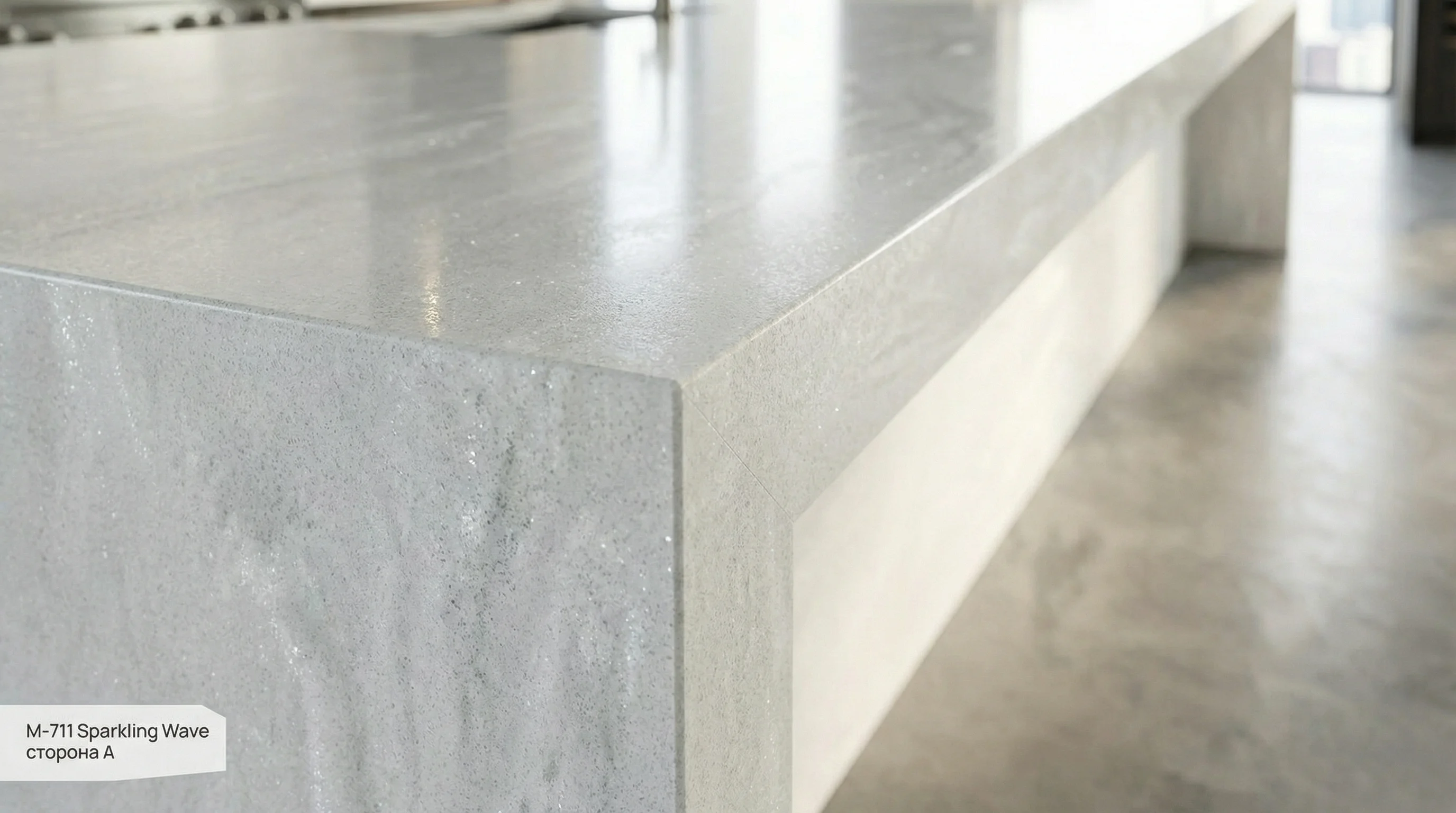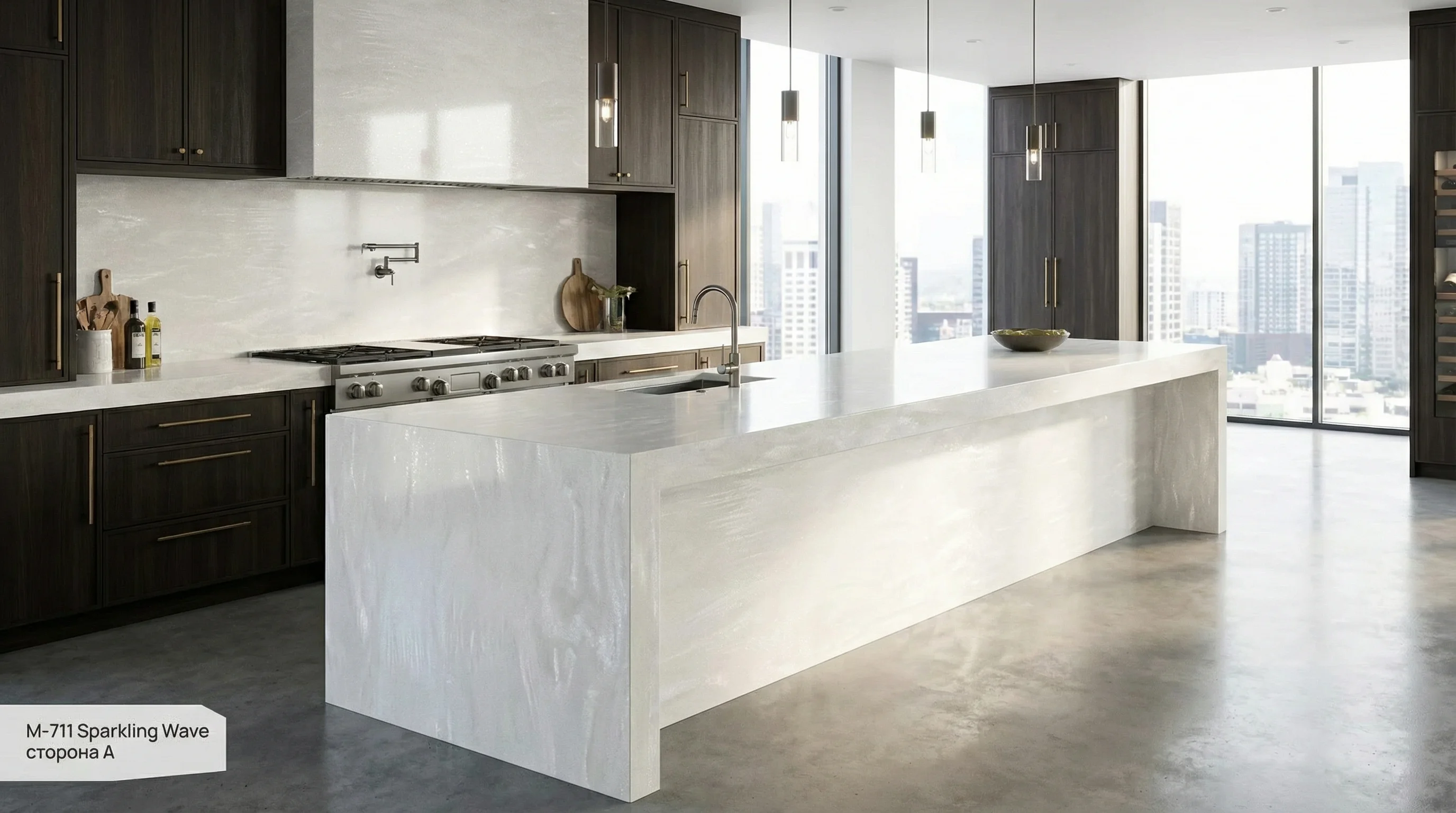 Этот материал воплощает в себе чистоту арктического утра и изящную динамику водной глади. Едва уловимая игра света на светлой, почти прозрачной поверхности создает эффект глубокого объема. Тончайшие переливы текстуры напоминают мягкий ритм волн, застывших в совершенном моменте, что привносит в современный интерьер ощущение гармонии и безупречного спокойствия.