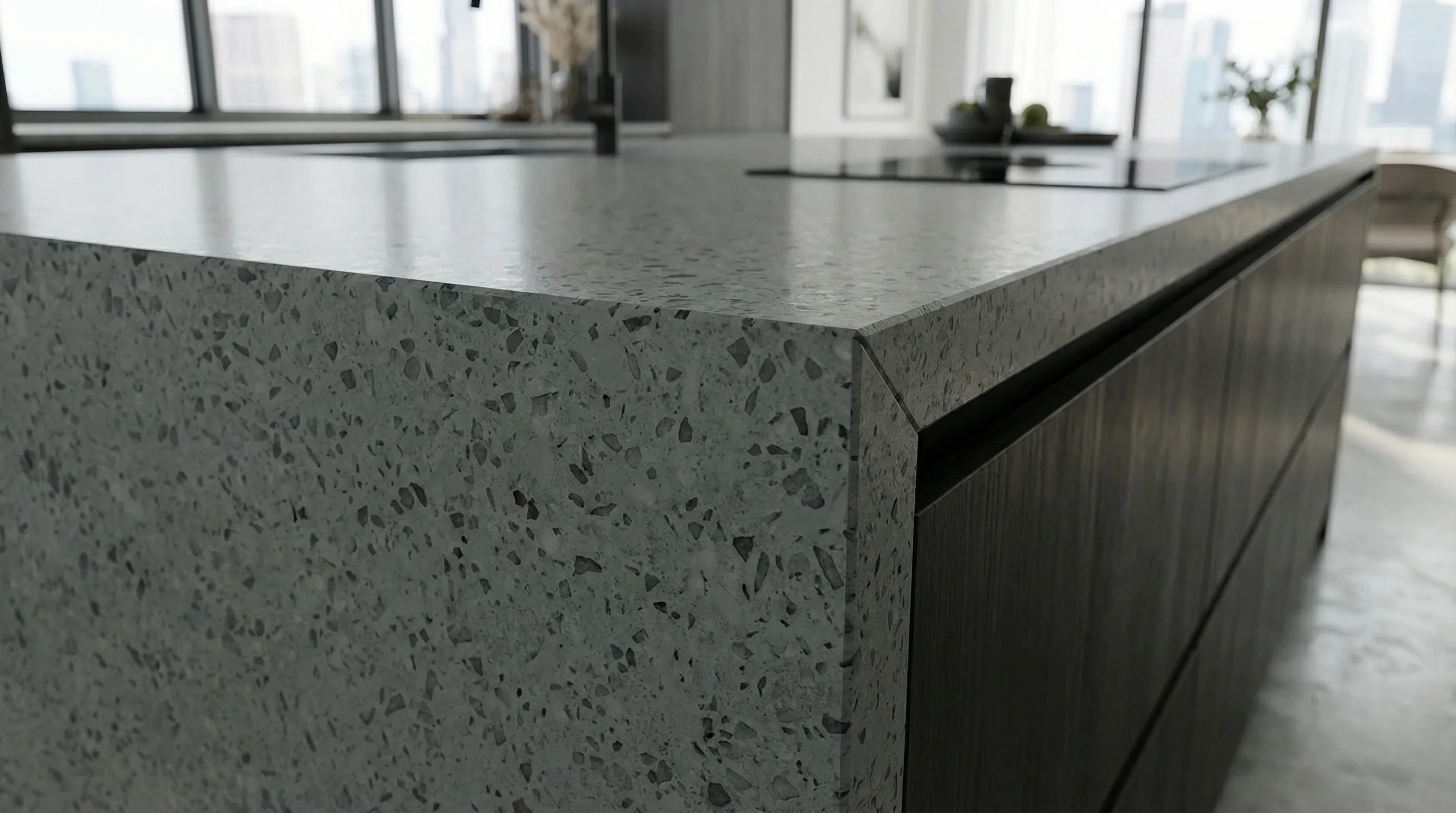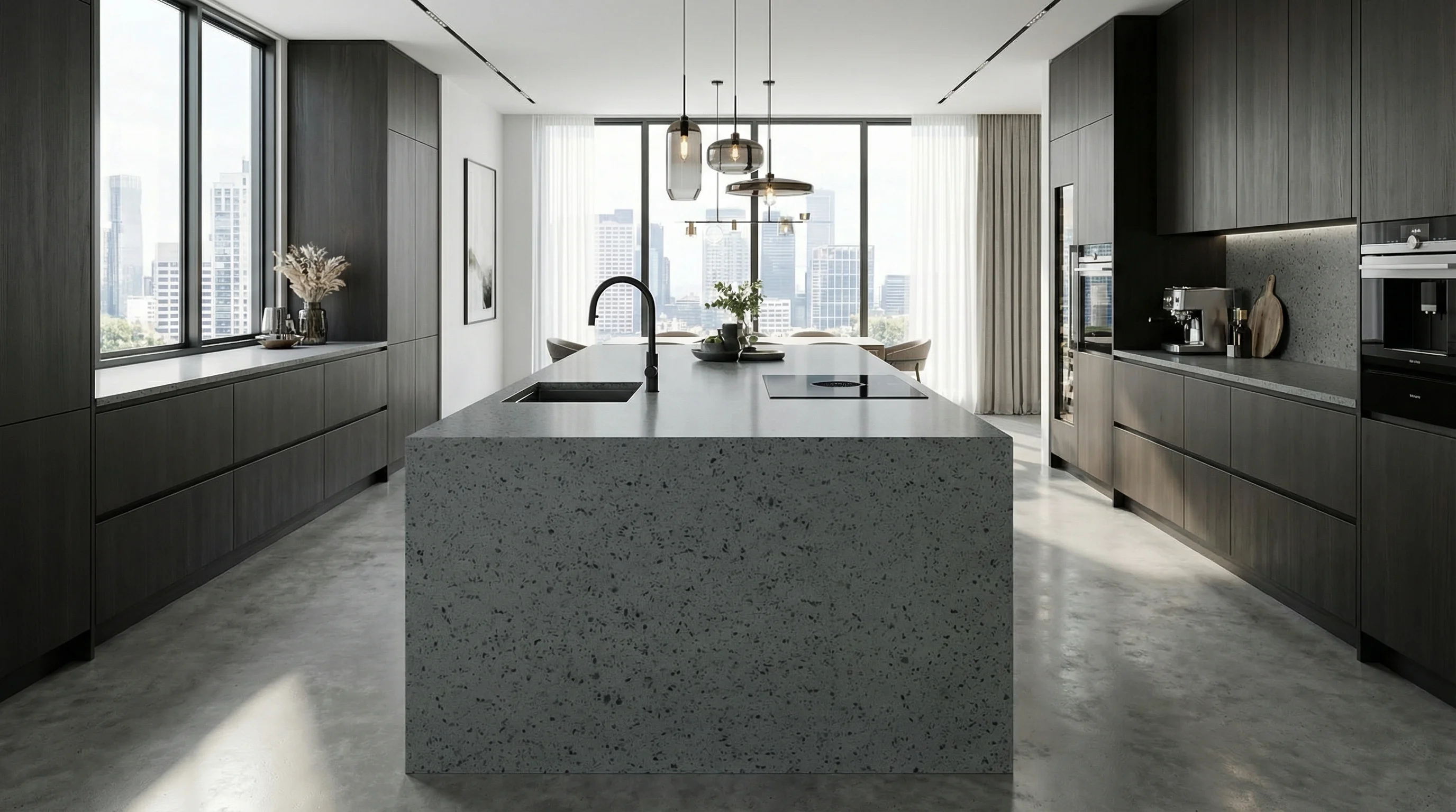 Лаконичный дизайн в сочетании с ощутимой монументальностью превращает рабочую зону в символ архитектурной чистоты. Отсутствие лишних деталей и природное спокойствие фактуры подчеркивают премиальный статус пространства, привнося в дом атмосферу осознанной роскоши и эстетического совершенства.