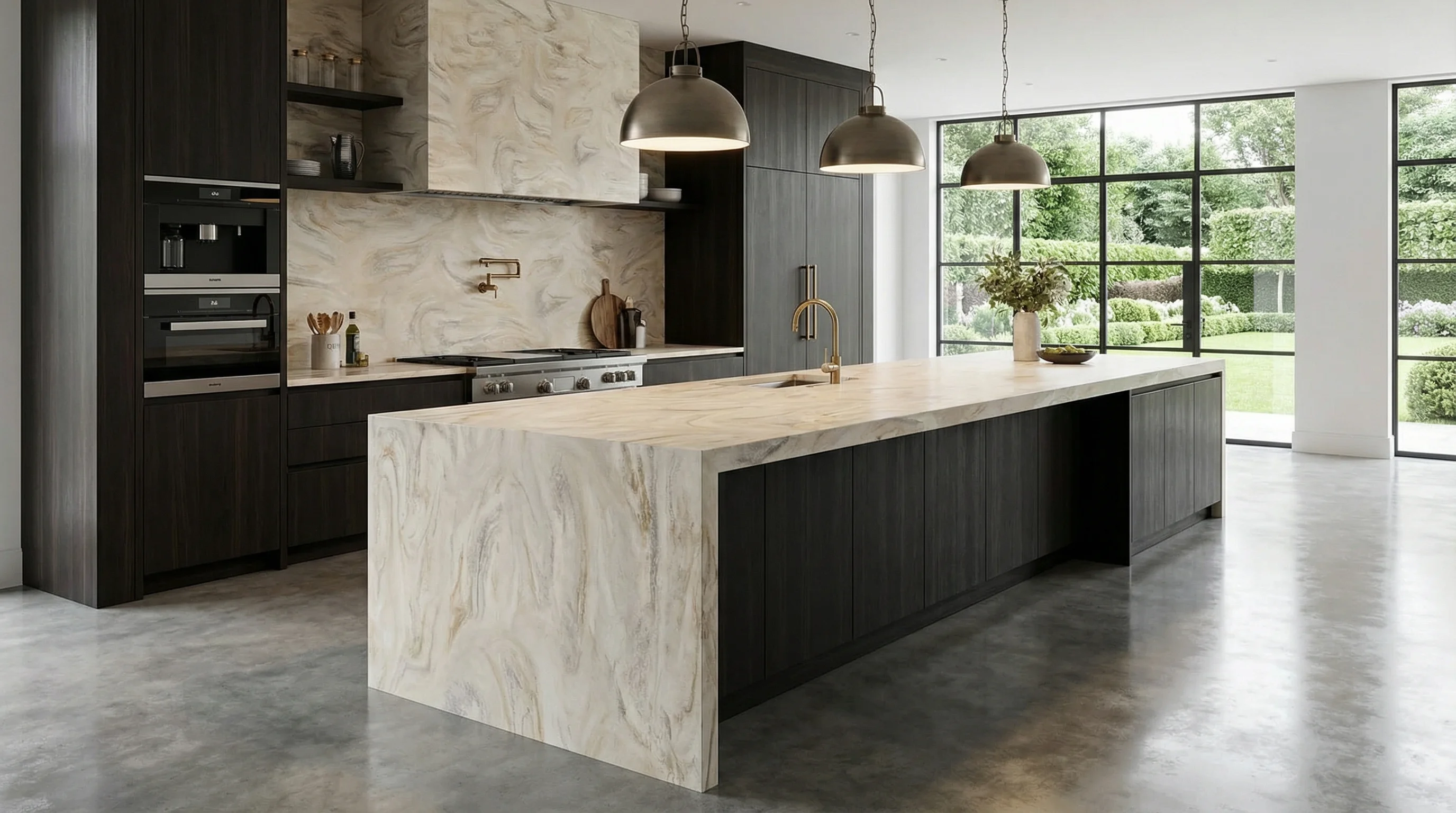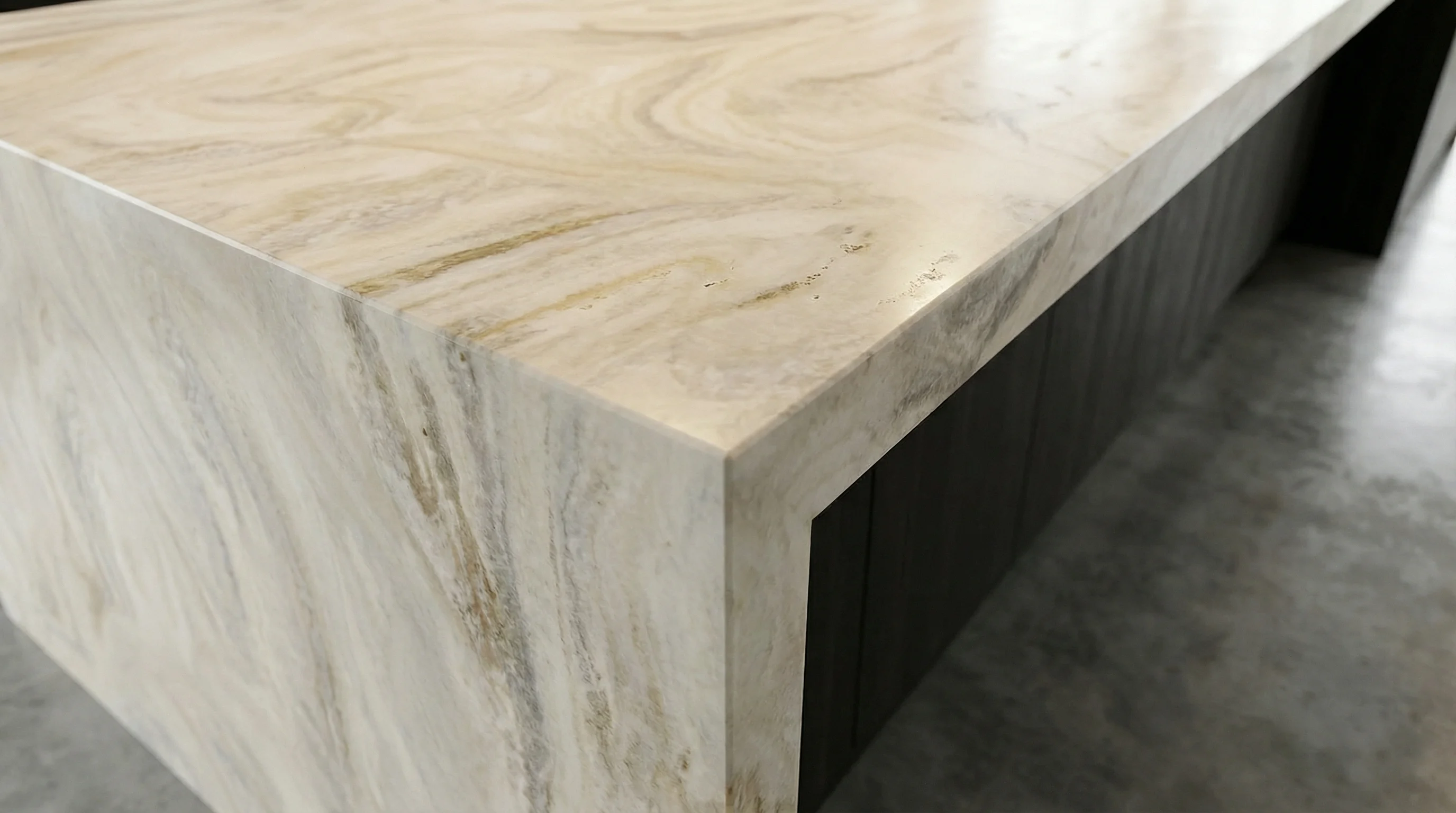 Эта поверхность воплощает в себе истинное благородство природных текстур и утонченную мягкость палитры. Плавные переходы теплых бежевых и кремовых оттенков переплетаются с едва уловимыми золотистыми жилами, создавая динамичный, но спокойный рисунок, напоминающий игру света на утренних облаках. Такая эстетика не просто дополняет интерьер, она наполняет пространство ощущением исключительного уюта и неброской роскоши.