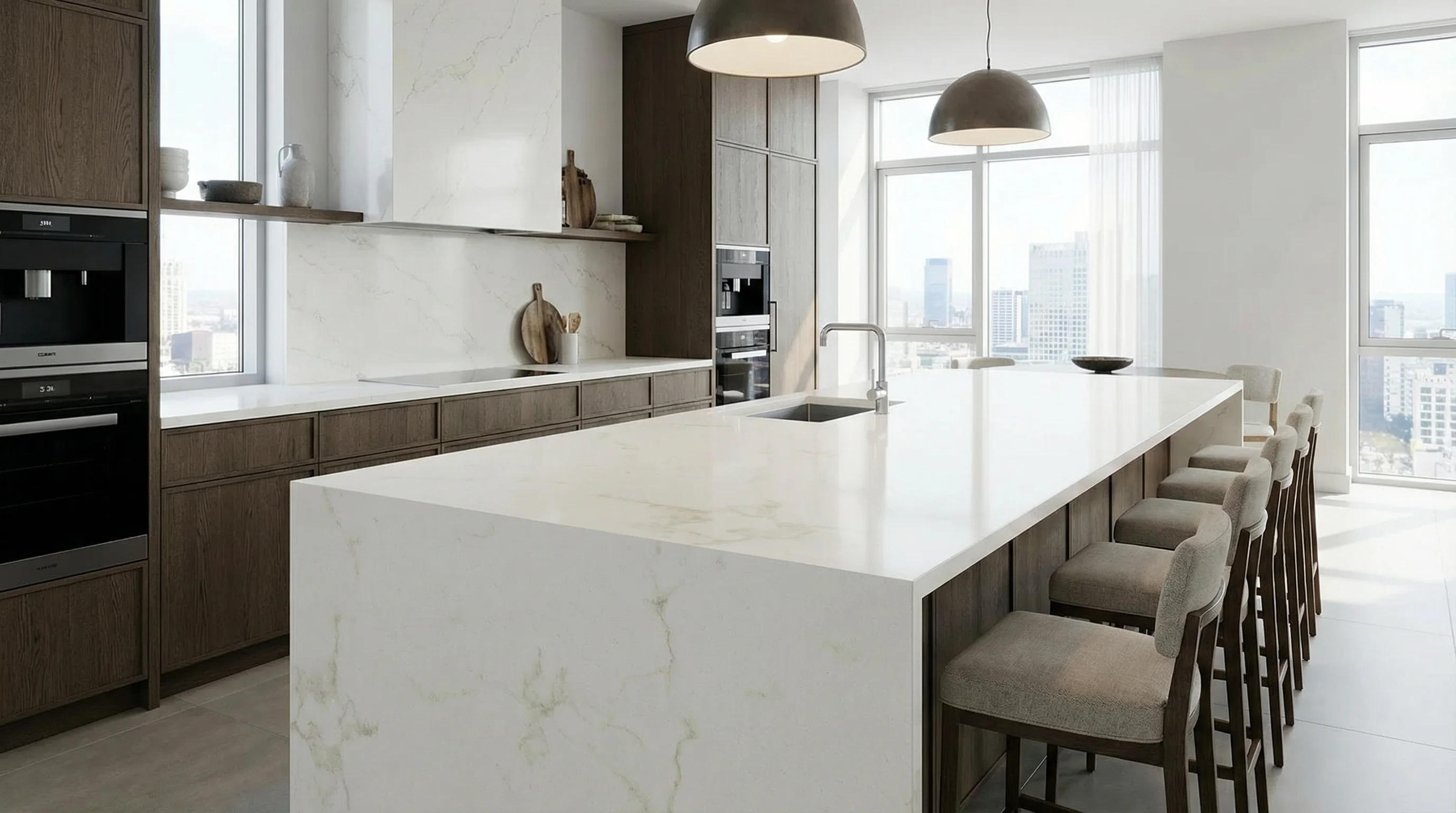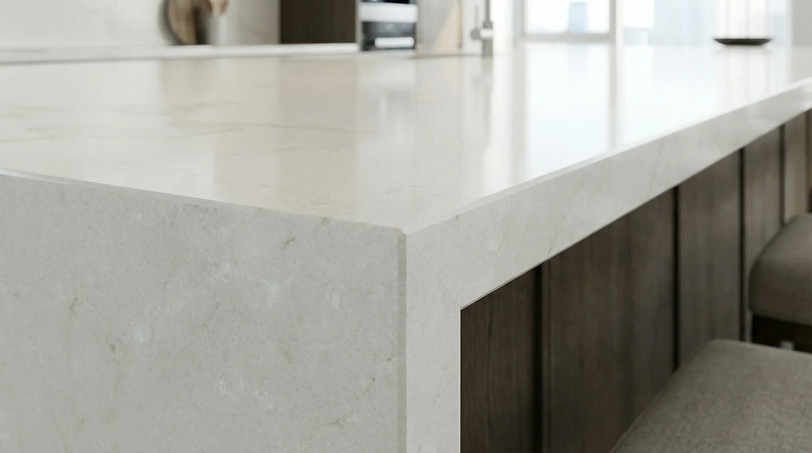 Этот материал воплощает в себе саму суть природной элегантности. На идеально чистом молочном фоне мягко проступают тонкие серые нити, создавая неповторимый графичный рисунок. Такая текстура наполняет пространство воздухом и светом, превращая привычную рабочую зону в центральный элемент интерьера, который притягивает взгляд и задает тон всей комнате.