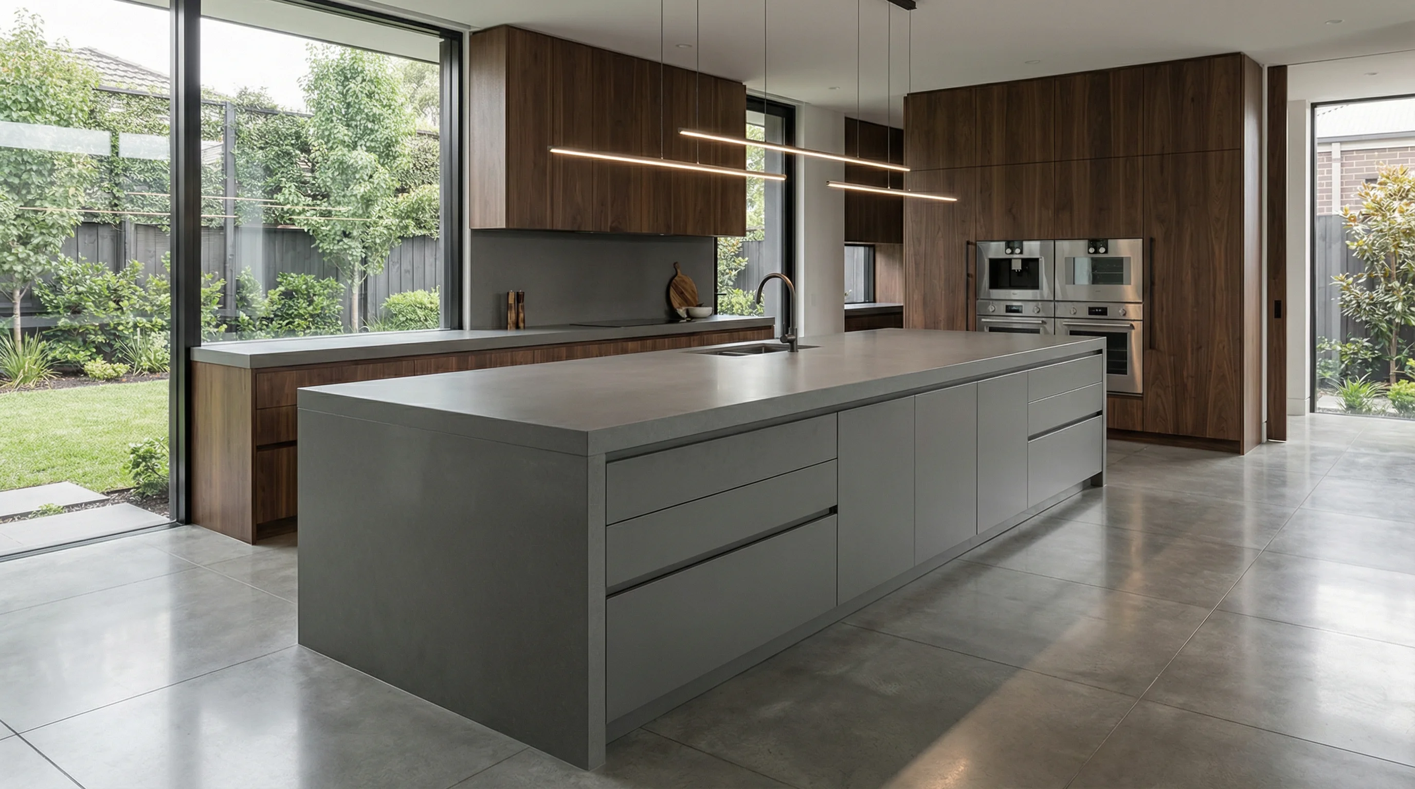 Эта поверхность воплощает в себе эстетику сдержанной роскоши и индустриального спокойствия. Текстура материала завораживает сложной игрой графитовых и пепельных оттенков, которые складываются в глубокий, многогранный узор. Естественные вкрапления создают мягкое мерцание, оживляющее пространство и придающее интерьеру характер непоколебимой уверенности.