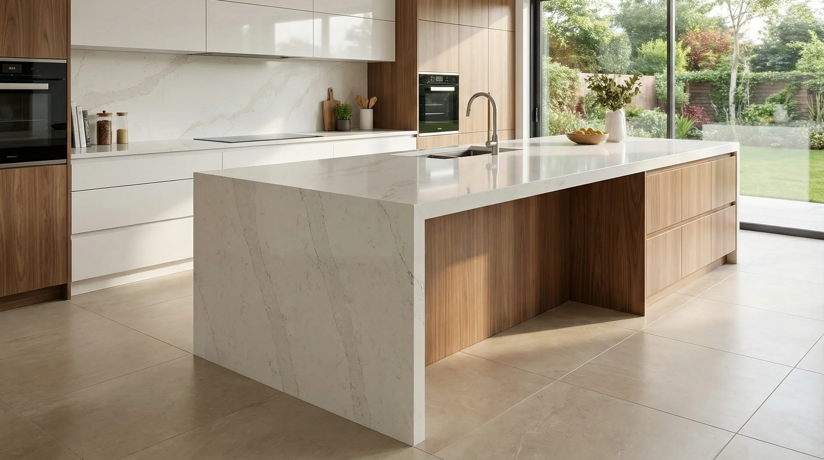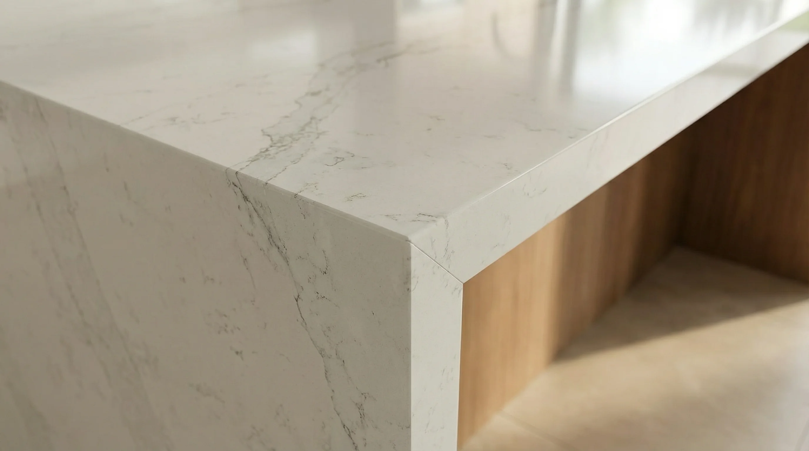 Статуарная Вуаль — это воплощение вечной элегантности и природной красоты, запечатленной в камне. Эта изысканная столешница из кварцевого агломерата обладает исключительной прочностью, что делает ее идеальным выбором для кухонных пространств, где требуется сочетание роскоши и практичности. Уникальный рисунок, имитирующий природный мрамор с мягкими белыми и золотистыми прожилками, придает интерьеру утонченность и аристократизм, создавая ощущение света и простора.