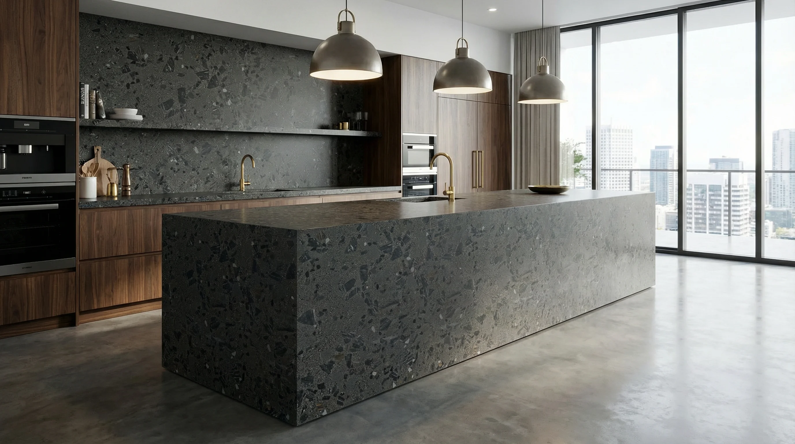 Представьте себе элегантность, неподвластную времени, воплощенную в этой роскошной рабочей поверхности. Уникальная текстура темного камня с изящными, контрастными вкраплениями напоминает загадочное ночное небо, создавая атмосферу утонченного стиля в любом интерьере. Этот материал идеально подходит для современных кухонь, становясь центральным элементом дизайна и подчеркивая безупречный вкус владельца.