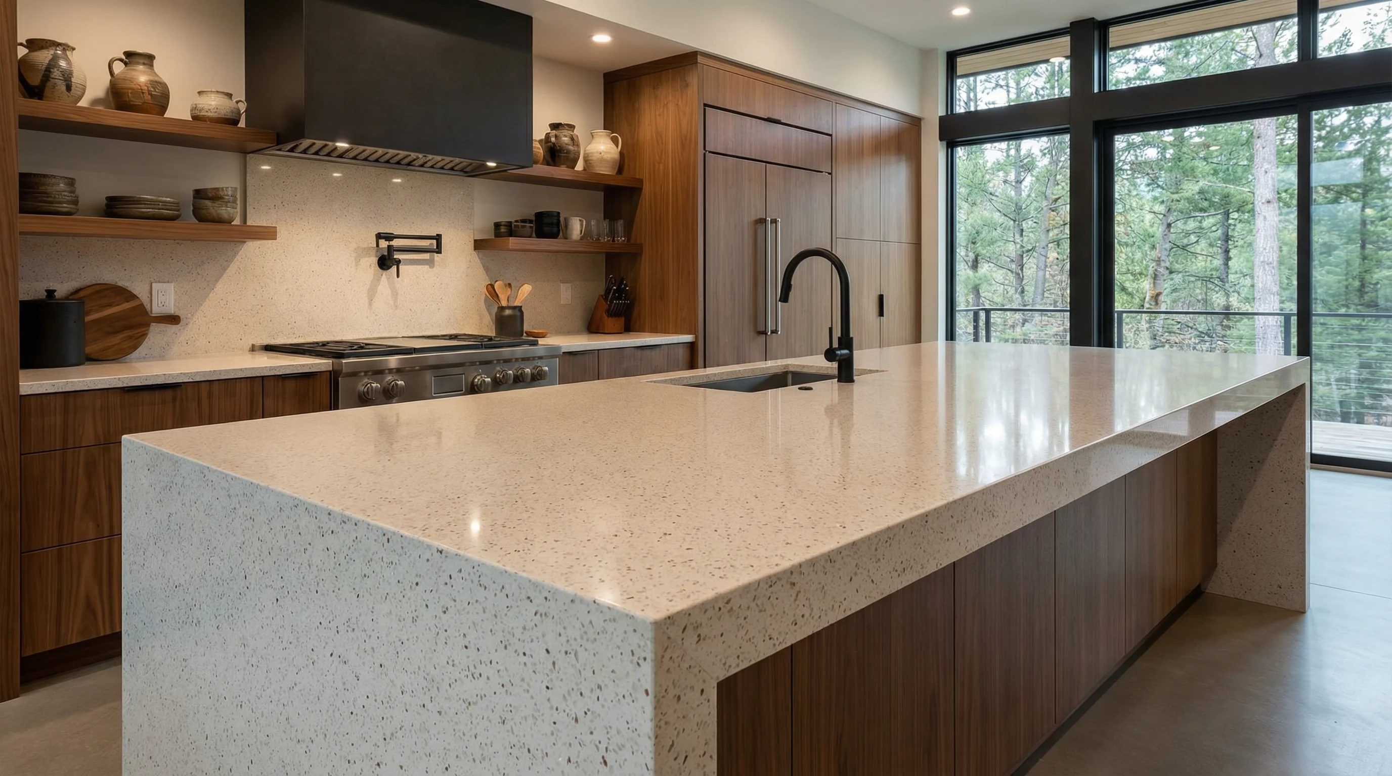 Эта элегантная поверхность — настоящее произведение искусства, вдохновленное песчаными дюнами и далекими созвездиями. Уникальная текстура камня "Светлая Астерия" сочетает нежную бежевую основу с тонкими вкраплениями коричневых и перламутровых частиц, создавая визуально глубокую и живую композицию, которая станет центральным элементом вашего кухонного пространства.