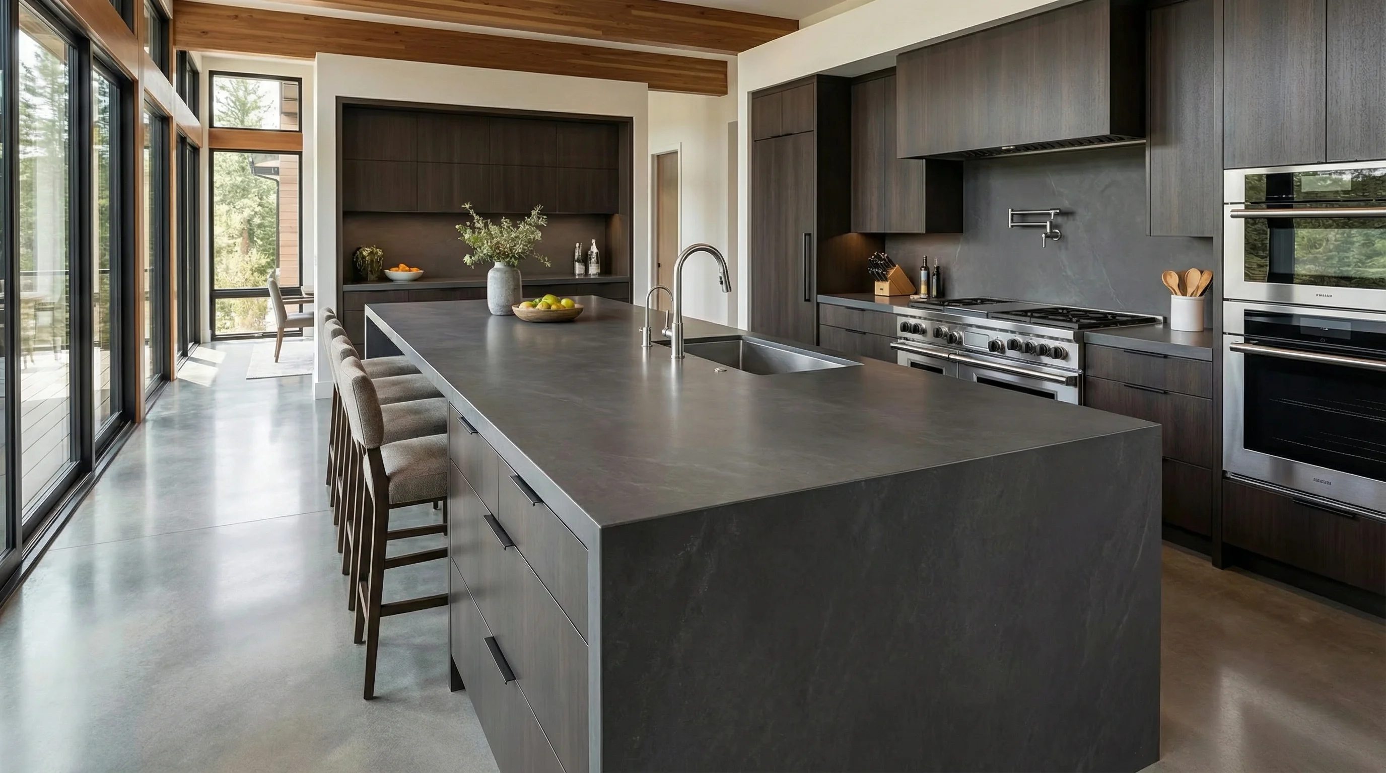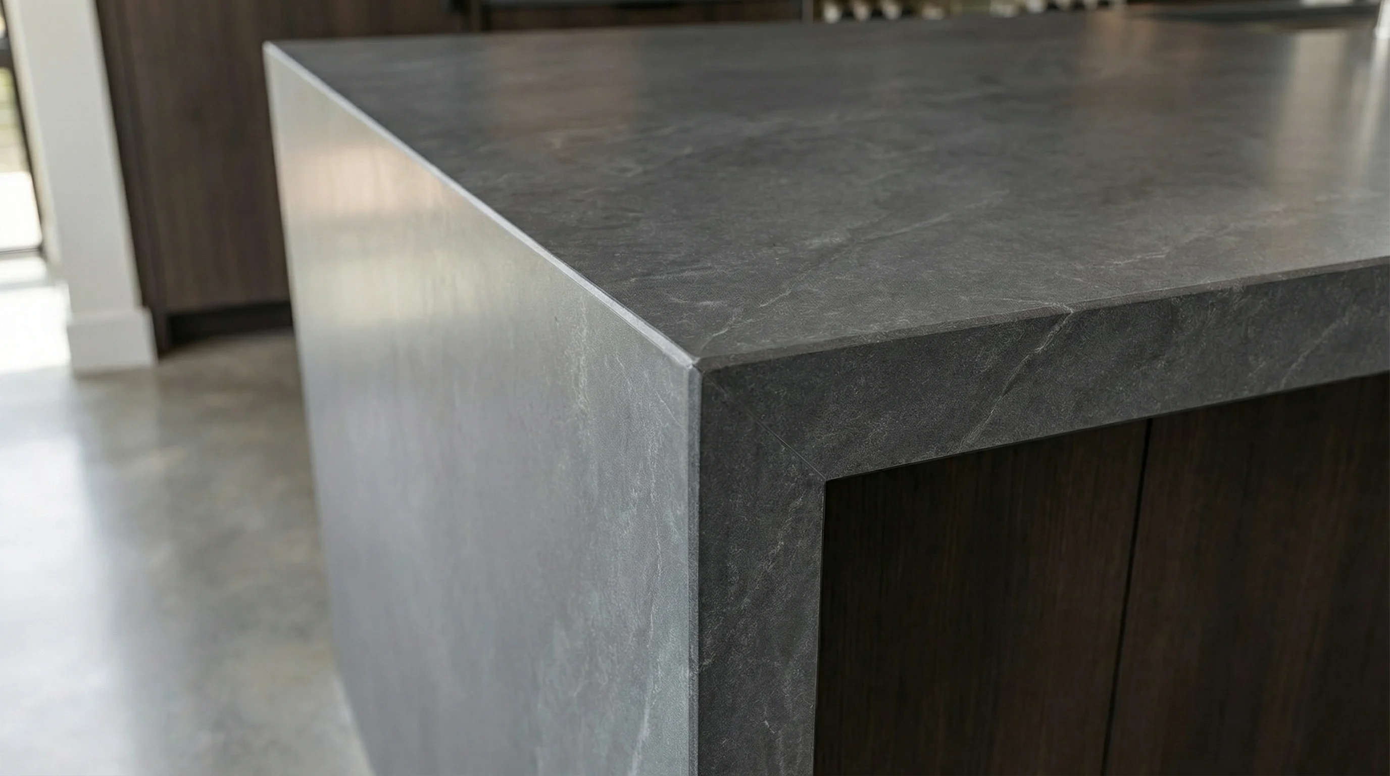 Этот материал олицетворяет философию сдержанного благородства и скрытой силы. Его поверхность, выдержанная в глубоких оттенках темной стали с едва уловимыми текстурными переходами, создает визуальный эффект монументальности и вековой надежности. Такая эстетика не просто дополняет современный интерьер, она формирует его фундамент, превращая рабочую зону в смысловой центр дома, где лаконичность встречается с мощью.