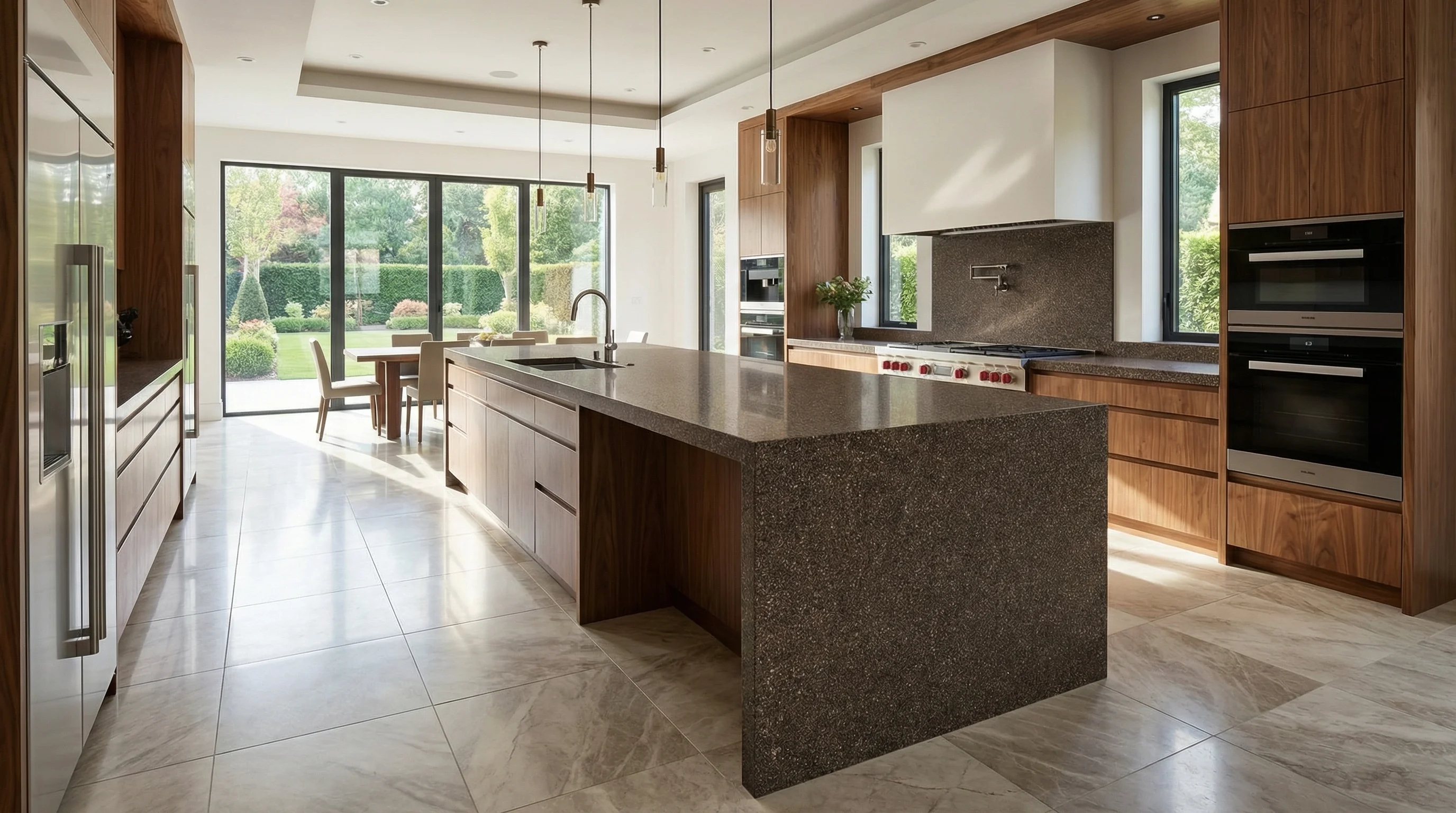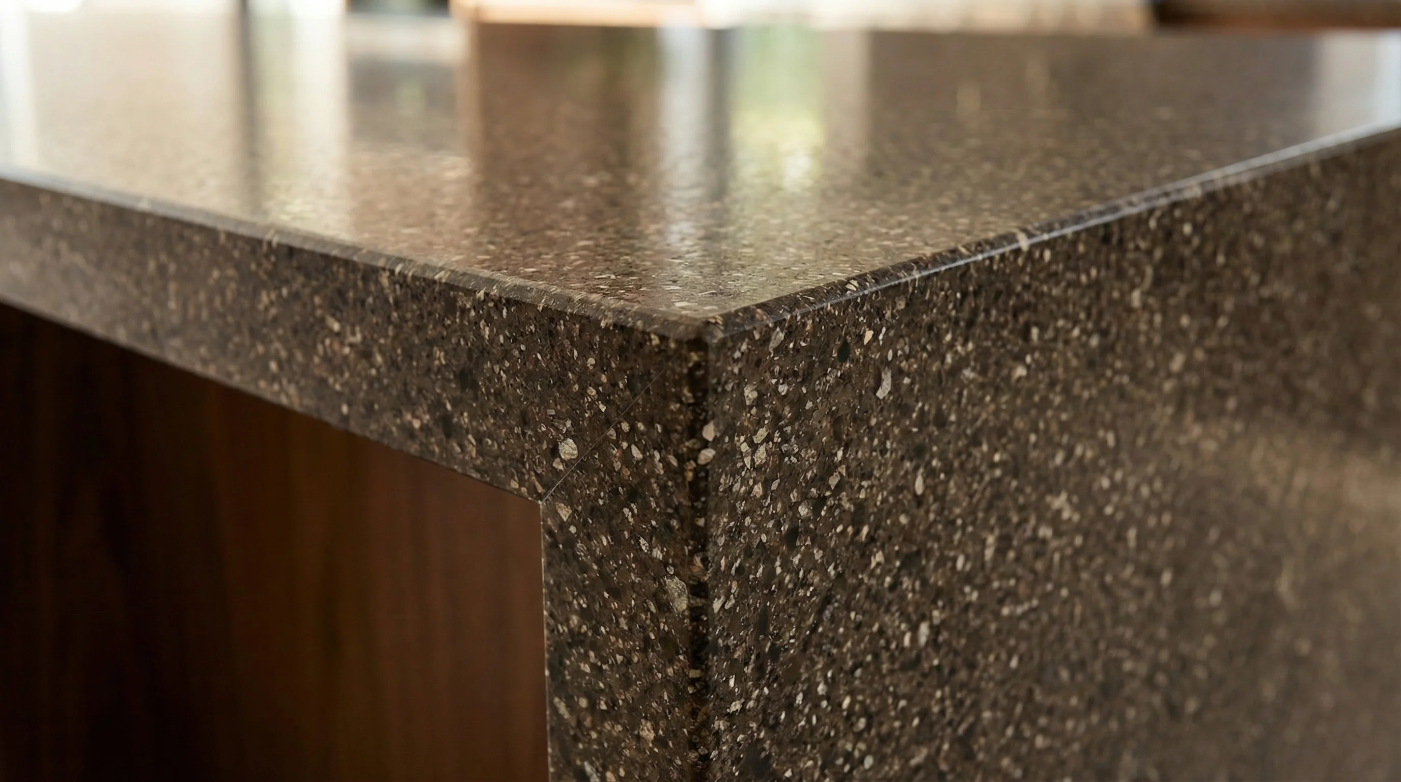 Это воплощение спокойной уверенности и природной гармонии. Поверхность притягивает взгляд своей сложной текстурой, где на глубоком кофейном фоне рассыпаны тысячи мелких светлых вкраплений, создающих эффект благородного мерцания. Такое сочетание оттенков добавляет интерьеру визуальную глубину и делает рабочую зону центральным элементом пространства, подчеркивая безупречный вкус владельца.