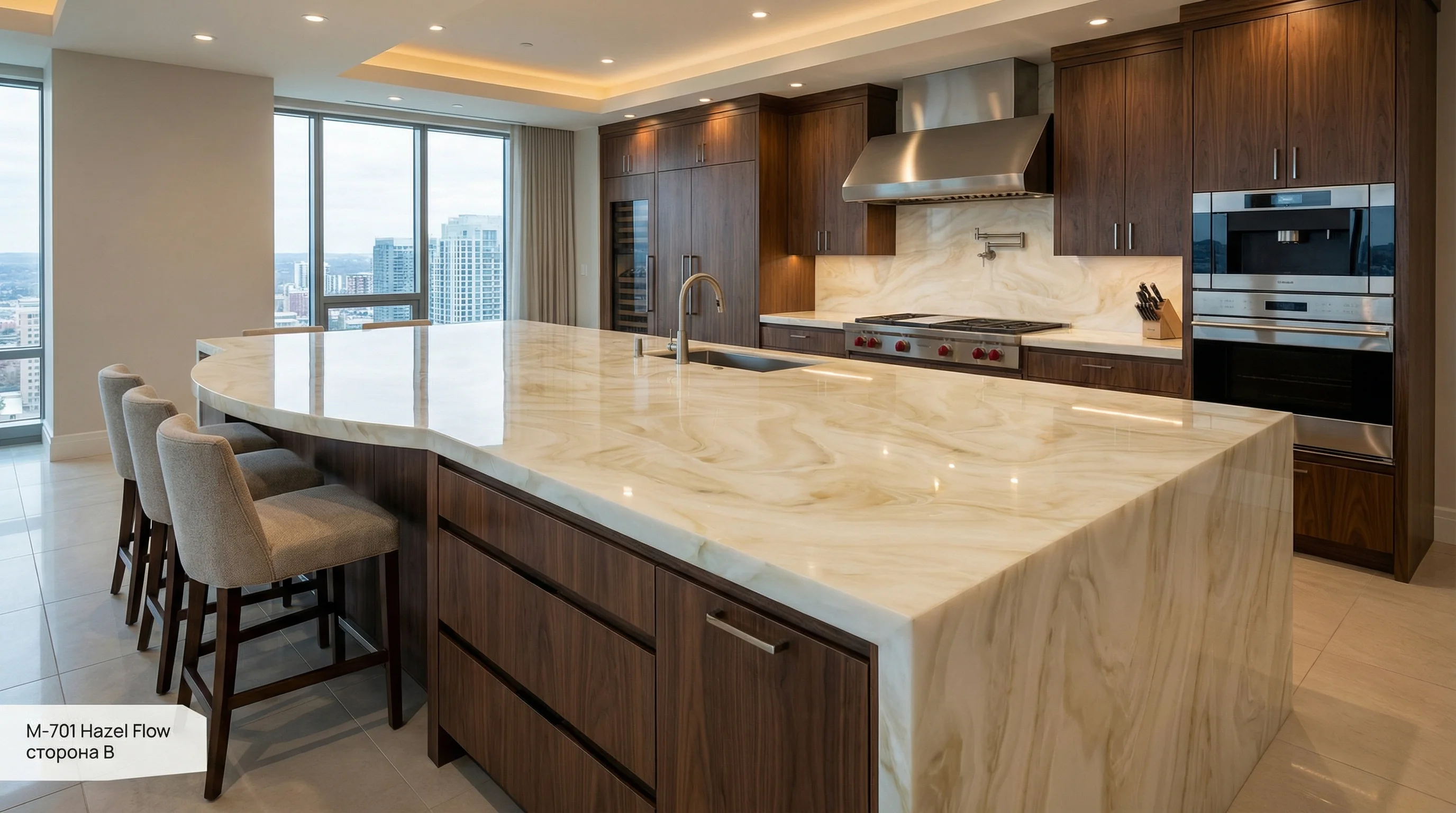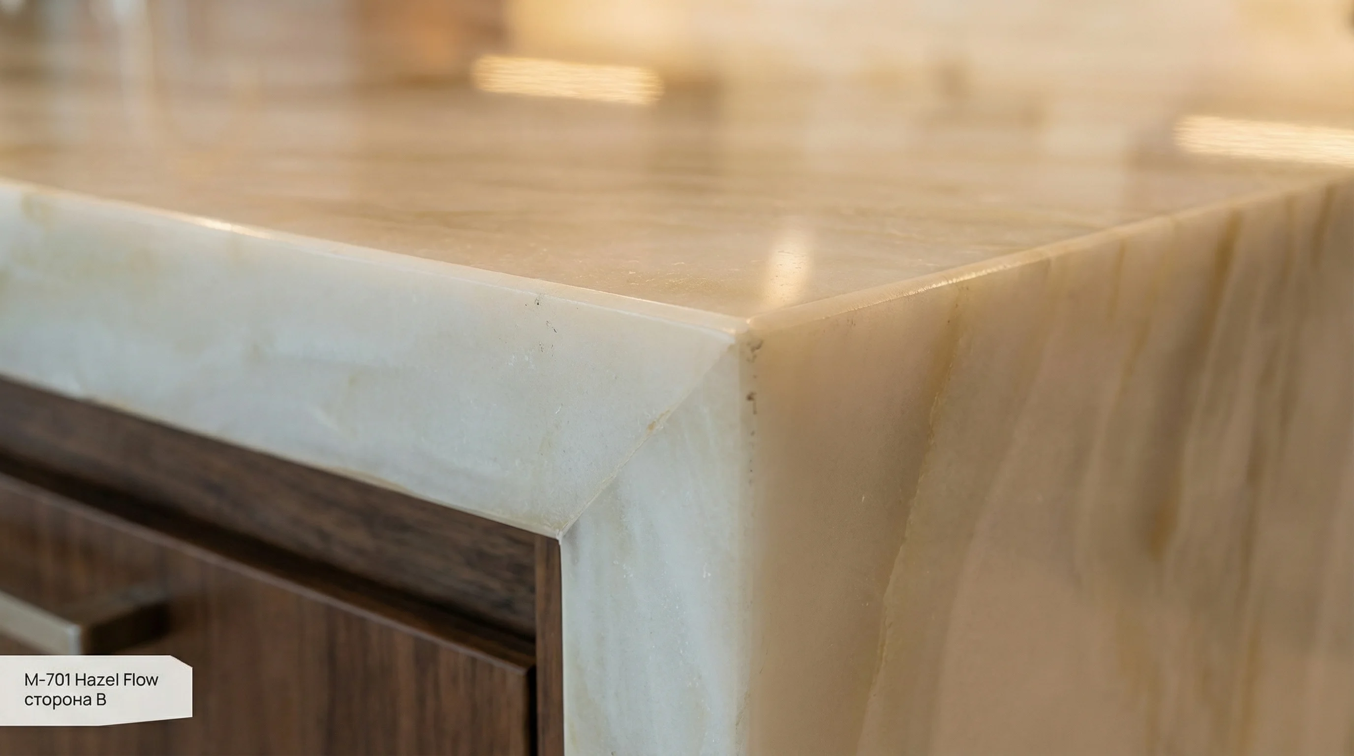 Поверхность завораживает гипнотическим переплетением молочных и теплых песочных оттенков, которые плавно сменяют друг друга, создавая эффект непрерывного движения. Мягкие карамельные прожилки придают рисунку особую глубину и объем, напоминая очертания песчаных дюн под лучами заходящего солнца. Это эстетическое решение наполняет пространство светом и спокойствием, становясь центральным элементом интерьера, который притягивает взгляд и подчеркивает исключительный вкус владельца.