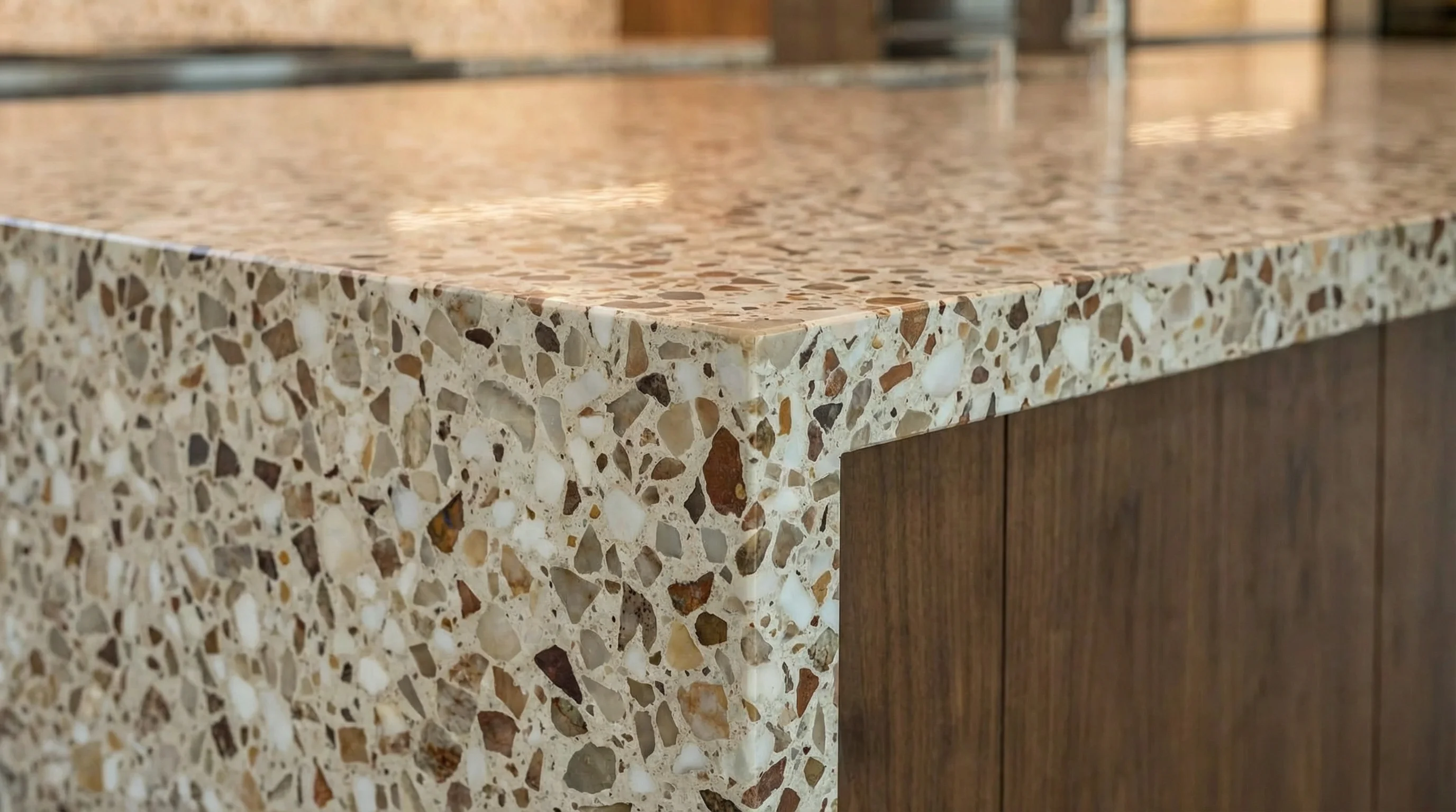 Поверхность изделия завораживает своей сложной, многослойной фактурой, в которой гармонично переплетаются оттенки топленого молока, мягкого бежа и глубоких кофейных акцентов. Этот ритмичный природный узор напоминает драгоценную мозаику, созданную самой землей на протяжении веков. Игра света на полированной плоскости подчеркивает глубину каждой частицы, наполняя пространство ощущением спокойной роскоши и обволакивающего уюта.