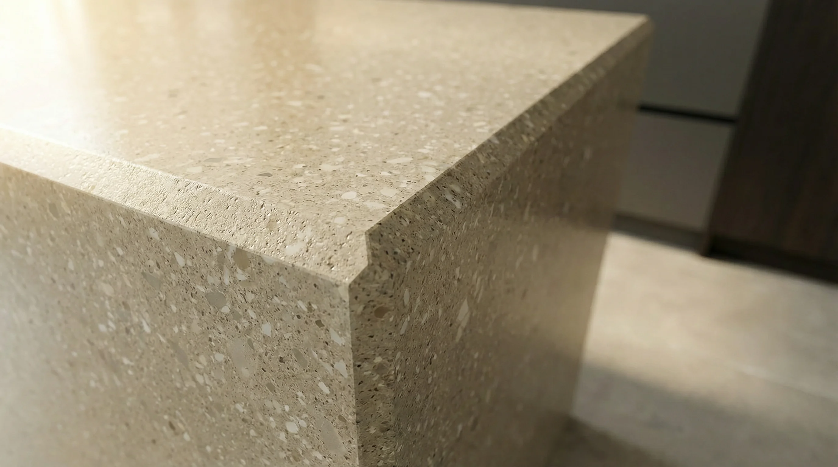 Эта поверхность воплощает в себе спокойное благородство природных минералов. Теплый бежево-песочный оттенок служит идеальным фоном для сложной текстуры, напоминающей мелкую россыпь морского песка с включениями светлого кварца и темных частиц. Такая визуальная глубина делает материал живым и интересным при ближайшем рассмотрении, сохраняя при этом элегантную визуальную целостность в масштабе всего интерьера.
