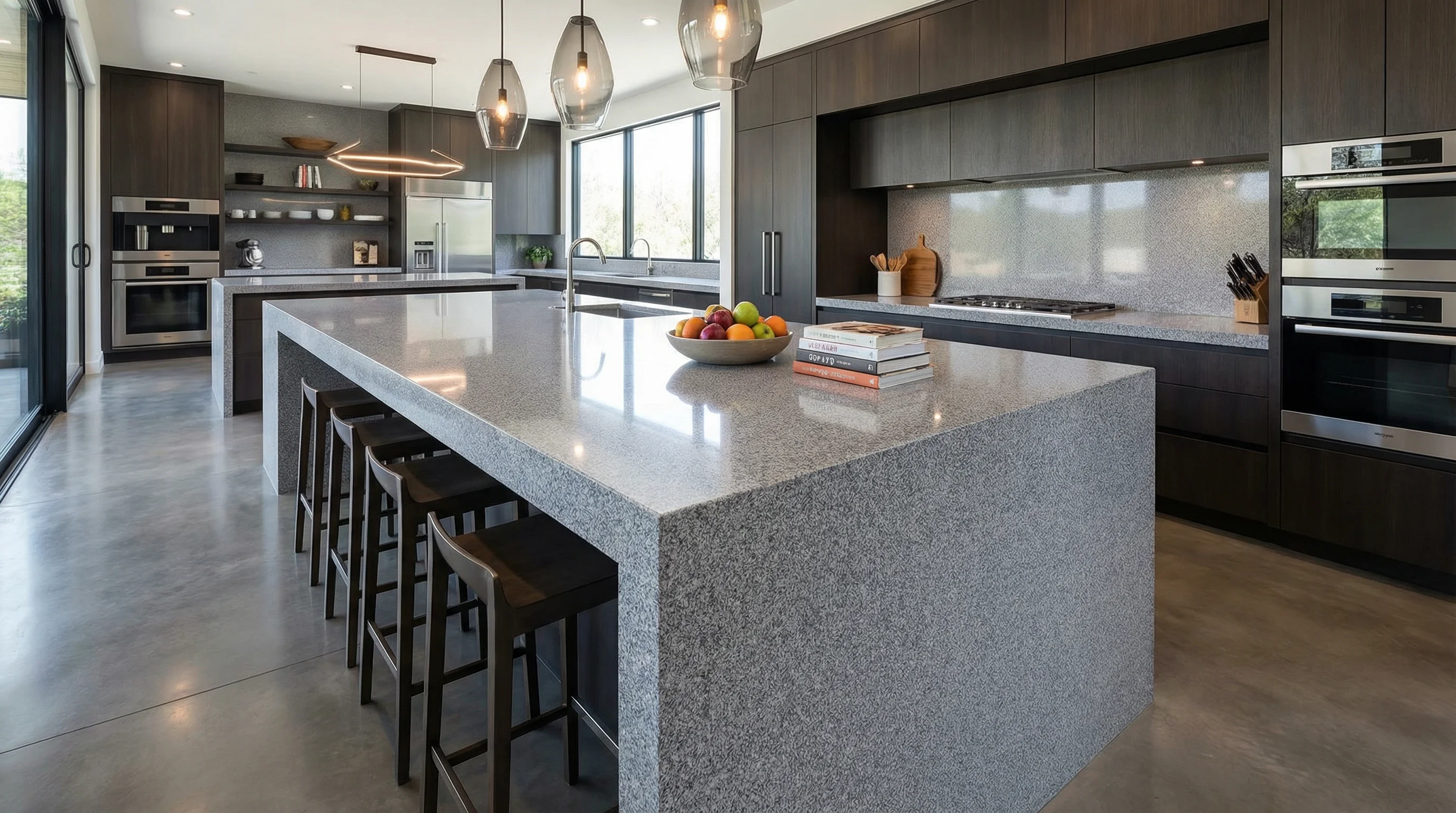 Это воплощение сдержанной роскоши и безупречного стиля. Поверхность завораживает своей глубиной: мириады мелких вкраплений создают уникальный рисунок, напоминающий мерцание далеких звезд или легкую дымку предрассветного тумана. Благородный серый оттенок служит идеальным фоном для современного интерьера, гармонично сочетаясь как с темными фасадами из натурального дерева, так и с холодным блеском металла.