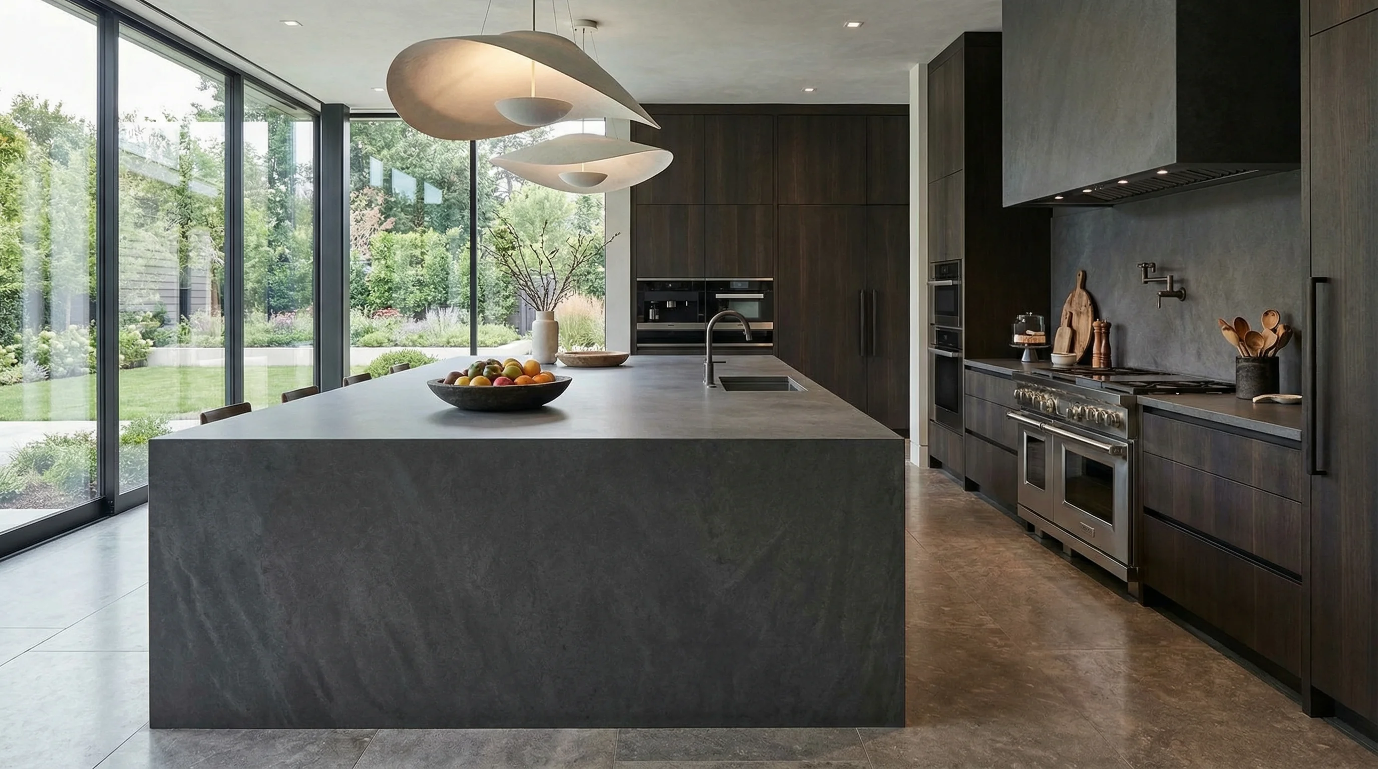 Этот материал олицетворяет собой эстетику сдержанной роскоши и архитектурной мощи. Его глубокий, насыщенный цвет с едва уловимыми нюансами текстуры напоминает поверхность застывшего металла или спокойные воды океана в сумерках. Благородная матовая фактура не только приятна на ощупь, но и создает в интерьере атмосферу фундаментального спокойствия, становясь визуальным центром современного пространства.