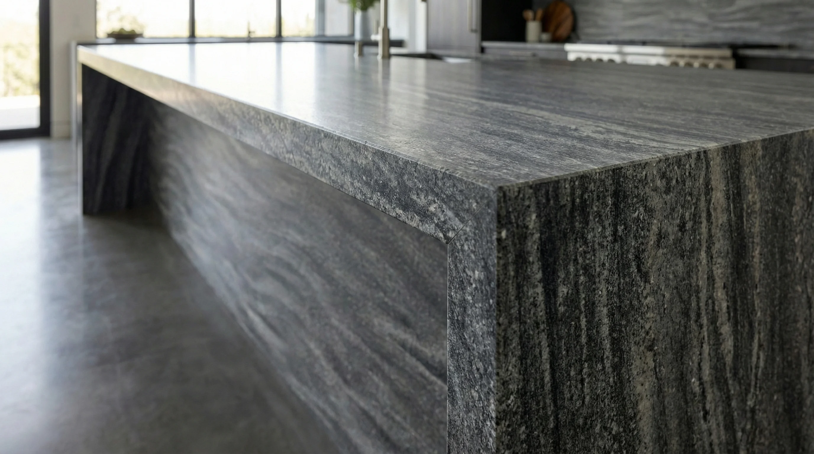 Поверхность изделия воплощает магию ночного неба, когда последние лучи заката растворяются в глубокой, насыщенной тени. Уникальный рисунок с мягкими, словно текучими серебристо-серыми волнами на темном фоне создает визуальное ощущение объема и бесконечного пространства. Каждая линия подчеркивает благородное происхождение материала, превращая рабочую зону в центральный арт-объект интерьера.
