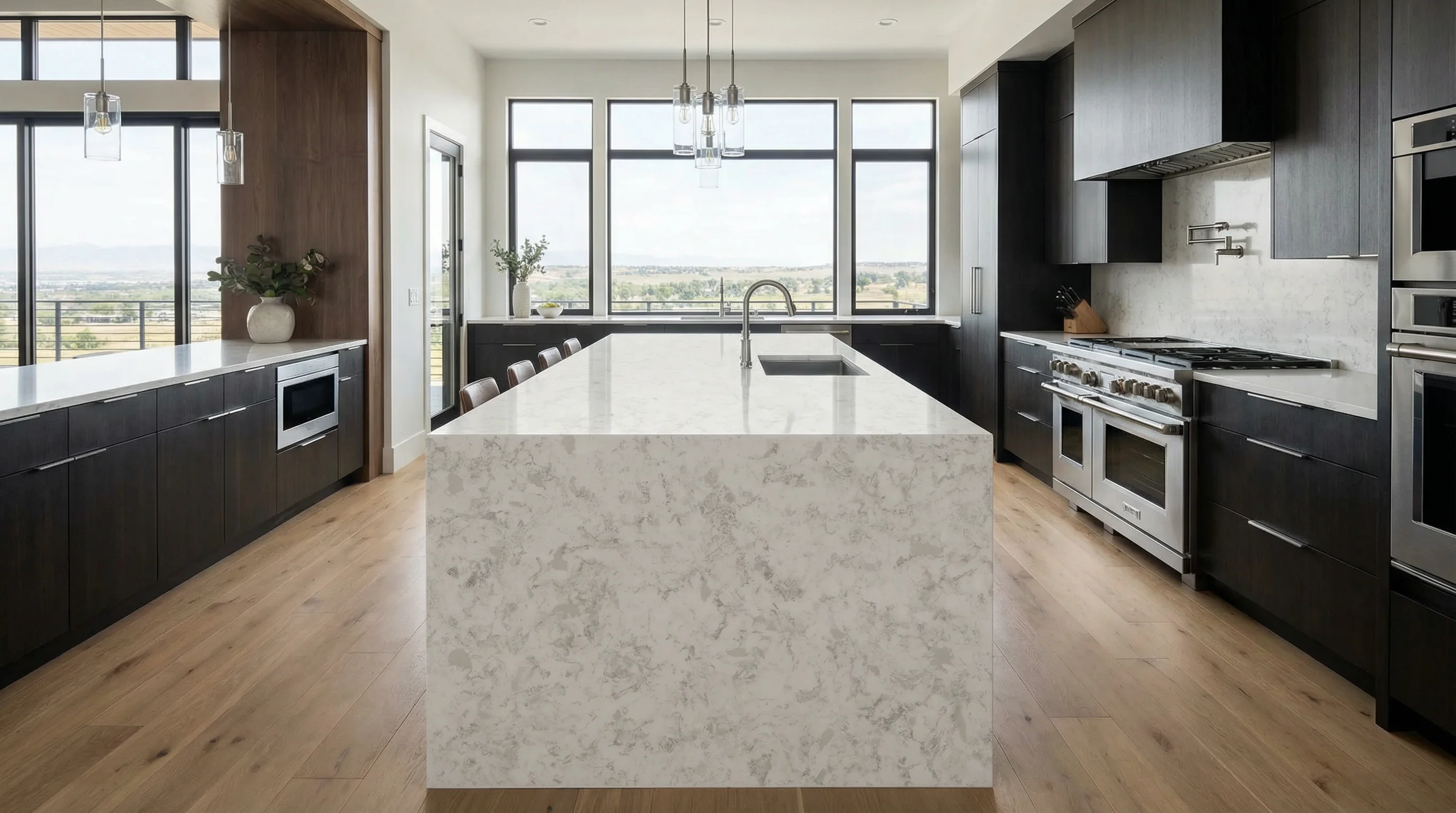 Поверхность этого изделия вдохновлена величественными ландшафтами, где застывшая природная мощь встречается с совершенством линий. Молочно-белый фон, пронизанный тонкими дымчатыми текстурами, создает иллюзию бесконечного пространства и легкости. Такая эстетика подчеркивает статус интерьера, превращая привычную функциональную зону в центральный архитектурный элемент дома.