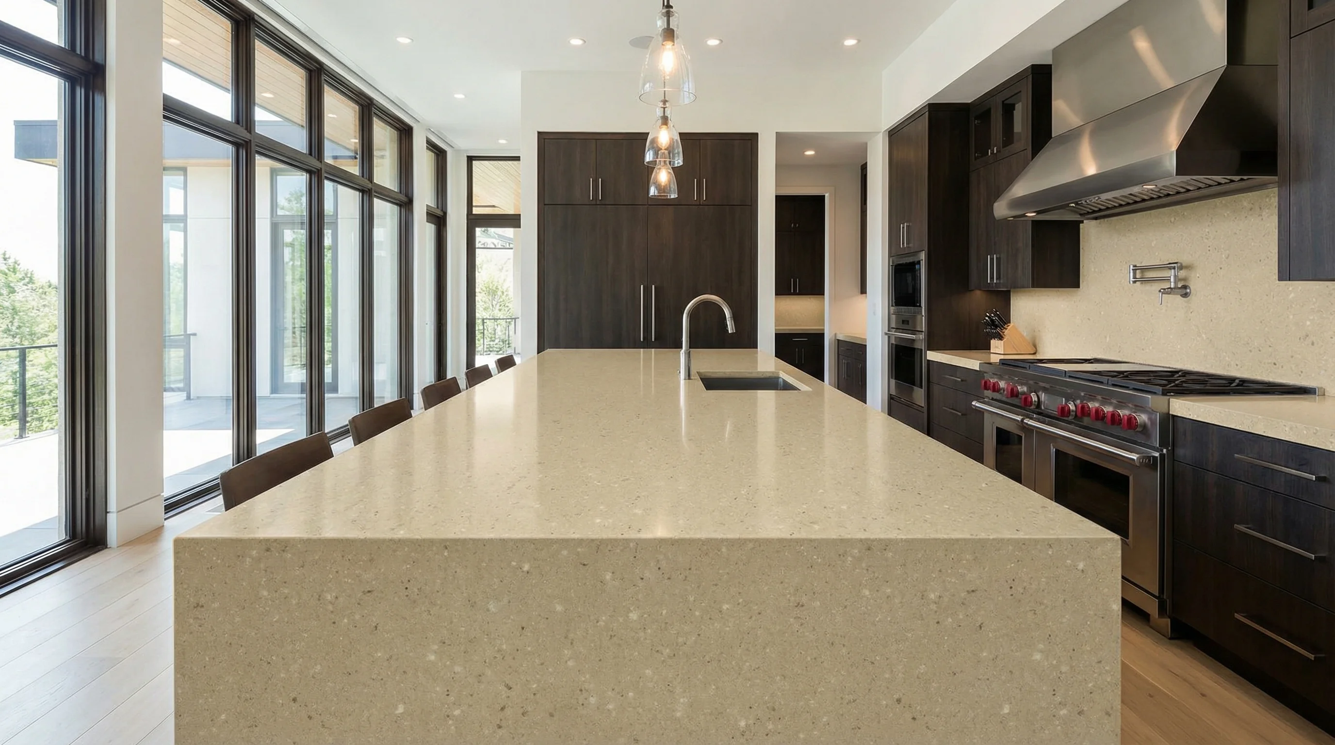 Это воплощение мягкого тепла и природного спокойствия, облеченное в безупречную современную форму. Глубокий оттенок обжаренного ореха с деликатными вкраплениями создает эффект живой, вибрирующей текстуры, которая меняется в зависимости от освещения. Шелковистая поверхность приглашает к прикосновению, наполняя интерьер ощущением благородного уюта и гармонии.