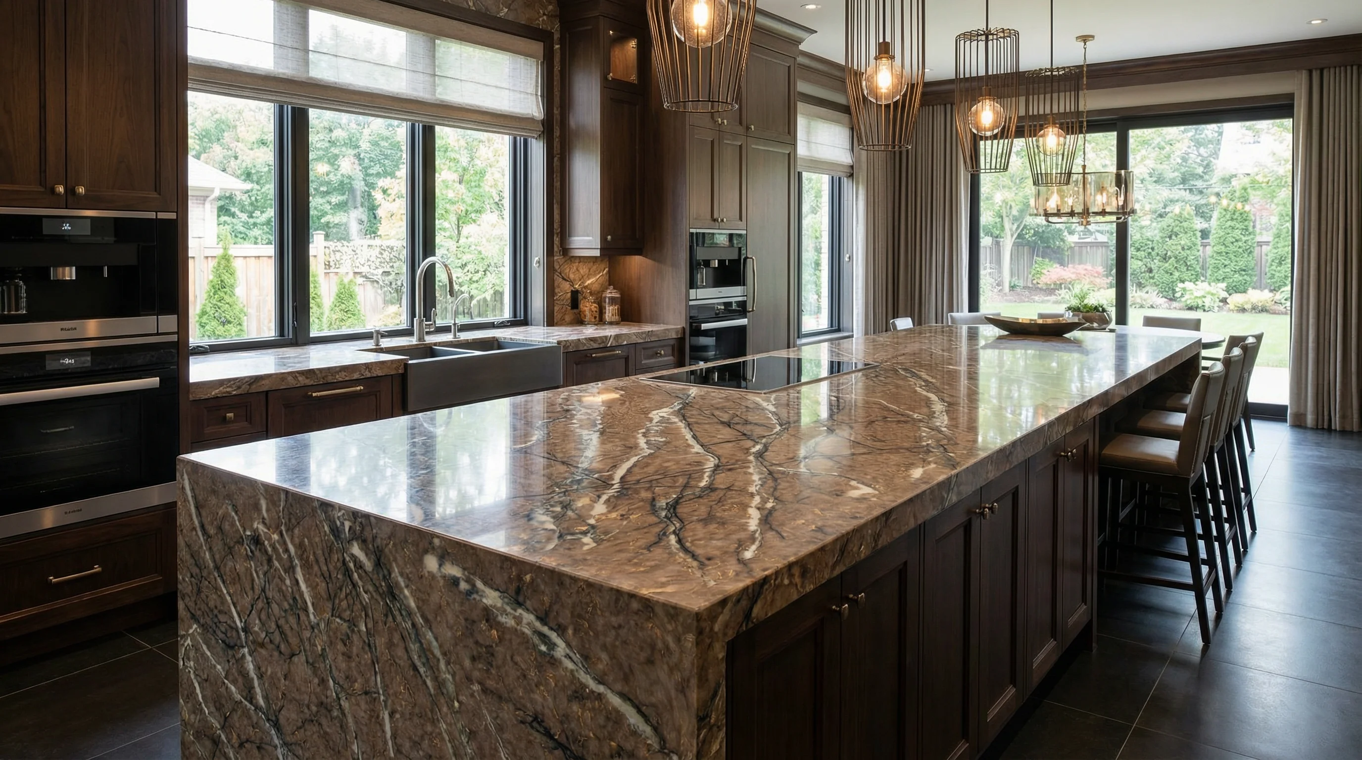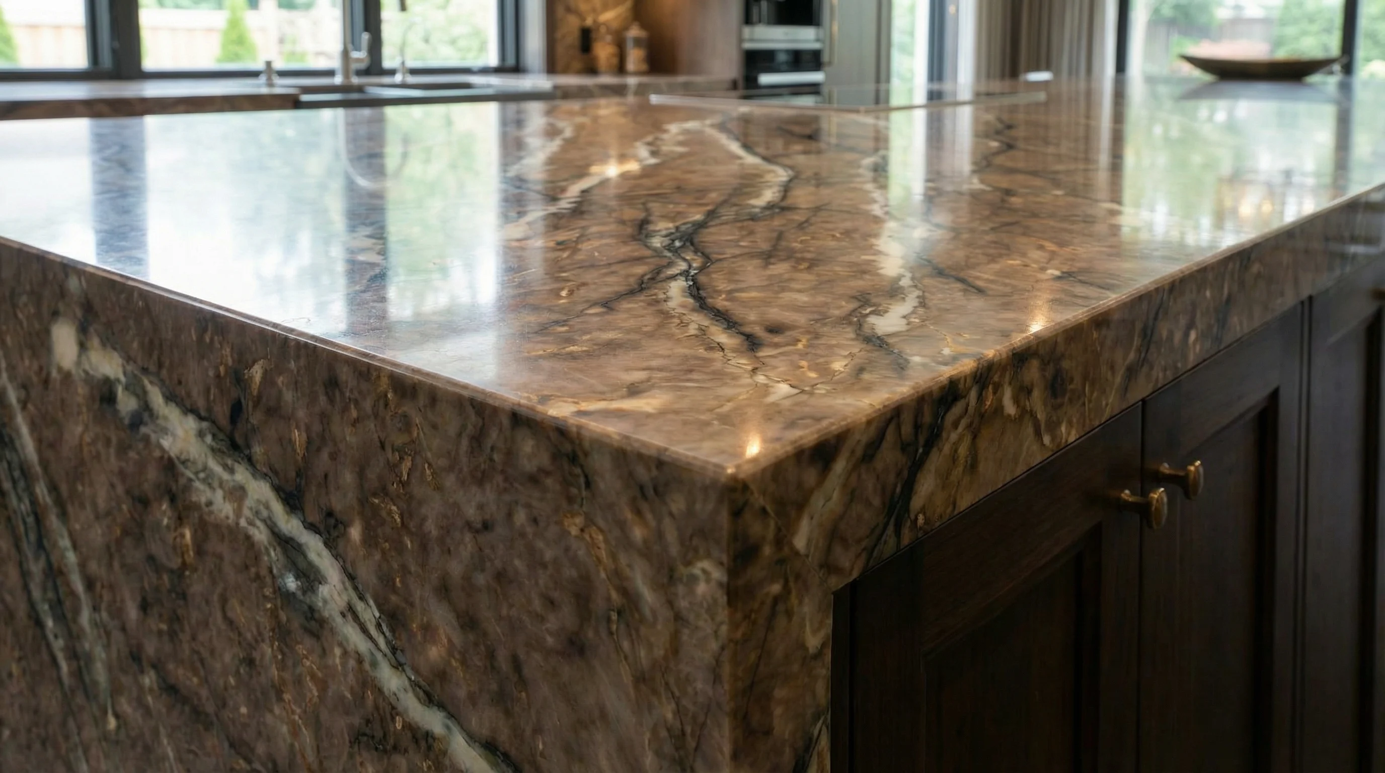 Глубокие терракотовые и шоколадные оттенки основы переплетаются с экспрессивными золотистыми жилами, создавая динамичный рисунок, напоминающий игру света на закатном небе. Текстура поверхности обладает исключительной визуальной глубиной: каждый изгиб и тонкий штрих подчеркивают природное благородство материала, превращая функциональную зону в центр притяжения всего интерьера.