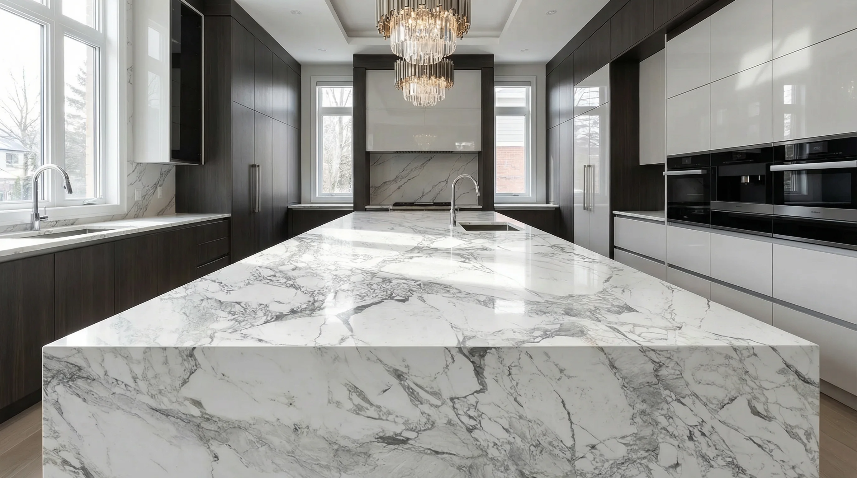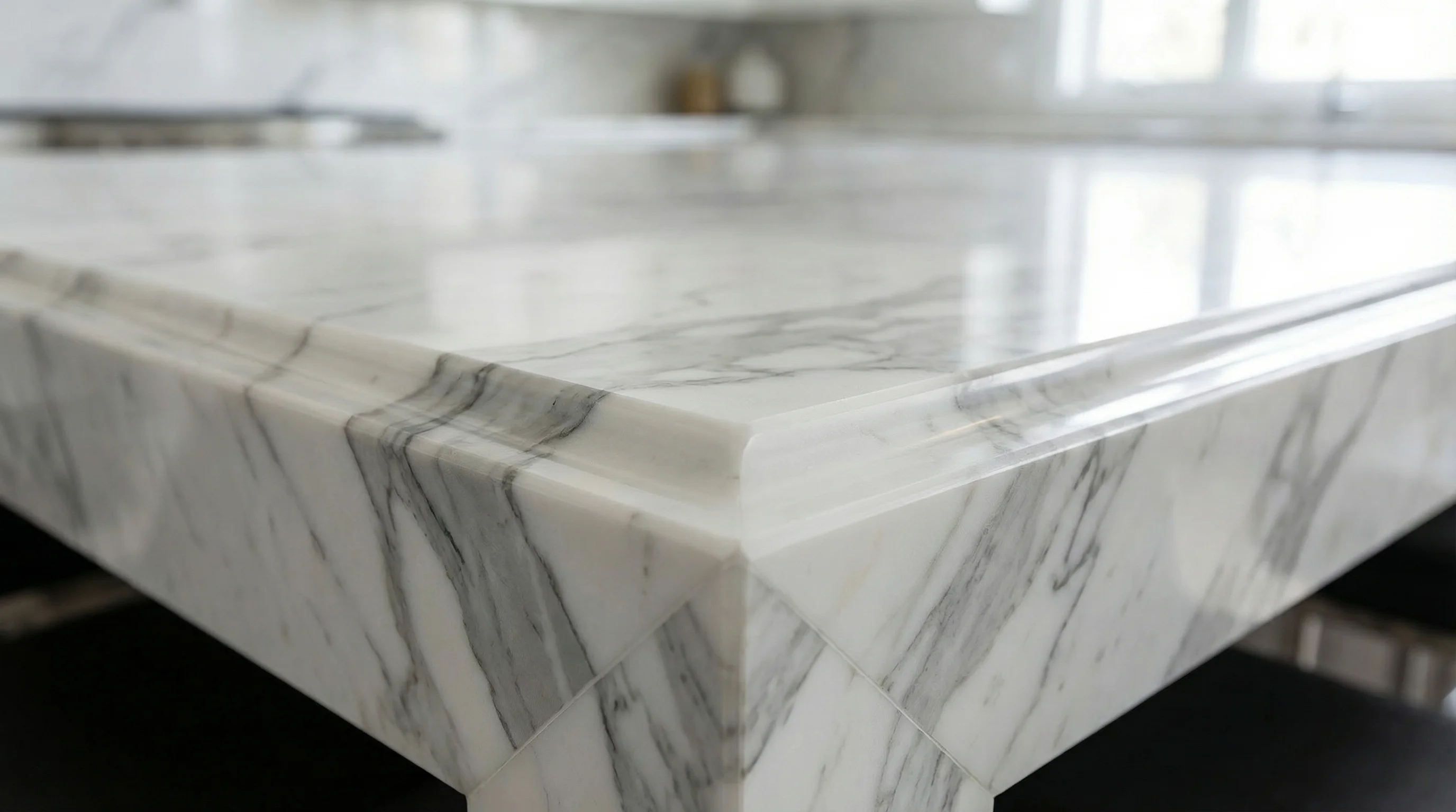 Этот элемент интерьера становится центральной точкой пространства, притягивая взгляды глубиной своей текстуры. Сложный рисунок серых вен, напоминающий динамичное движение предрассветных облаков, создает неповторимую художественную композицию на идеально белом фоне. Благородный холод поверхности и мягкий блеск подчеркивают премиальный статус обстановки, привнося в дом атмосферу безупречной чистоты и гармонии.