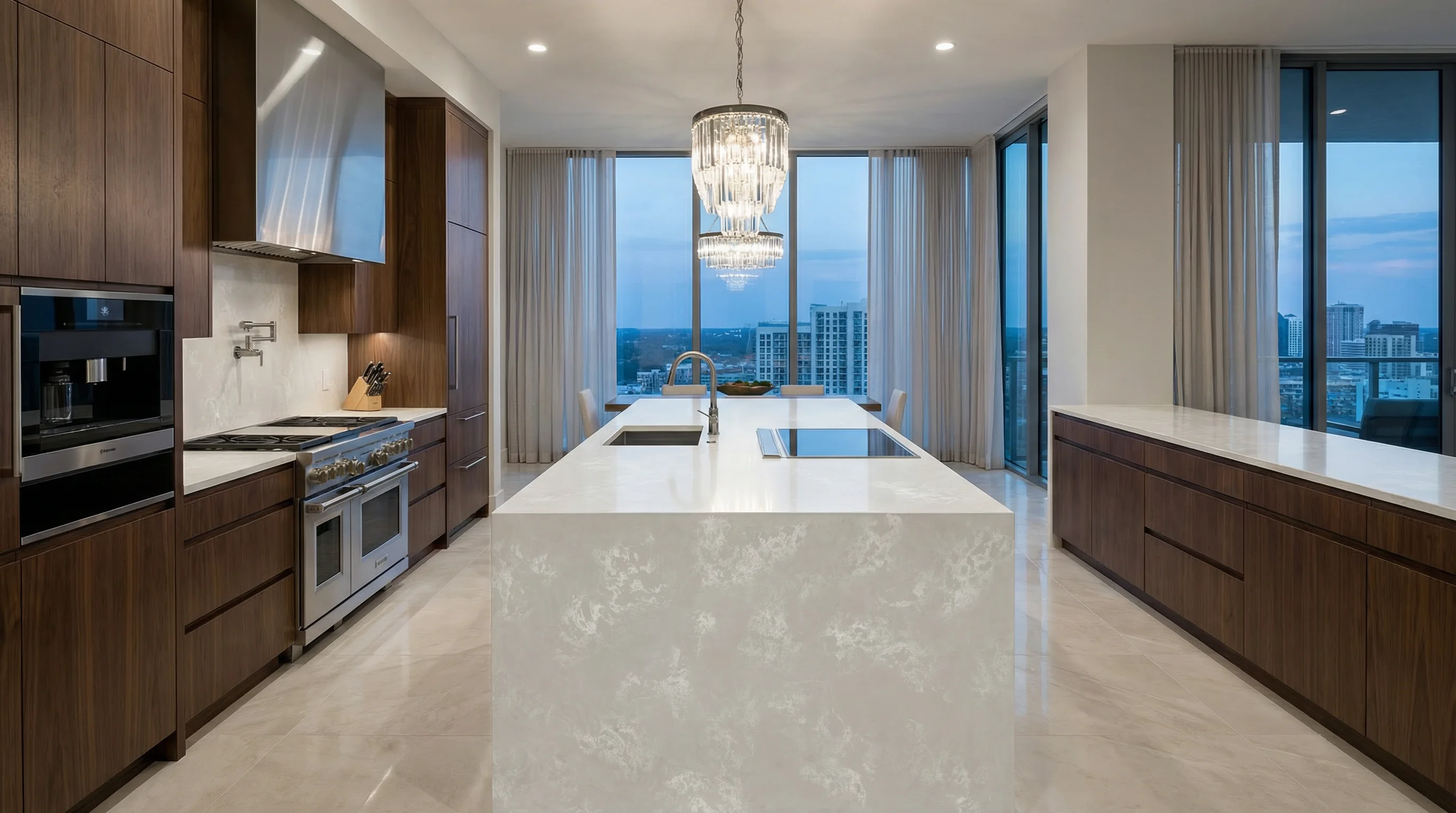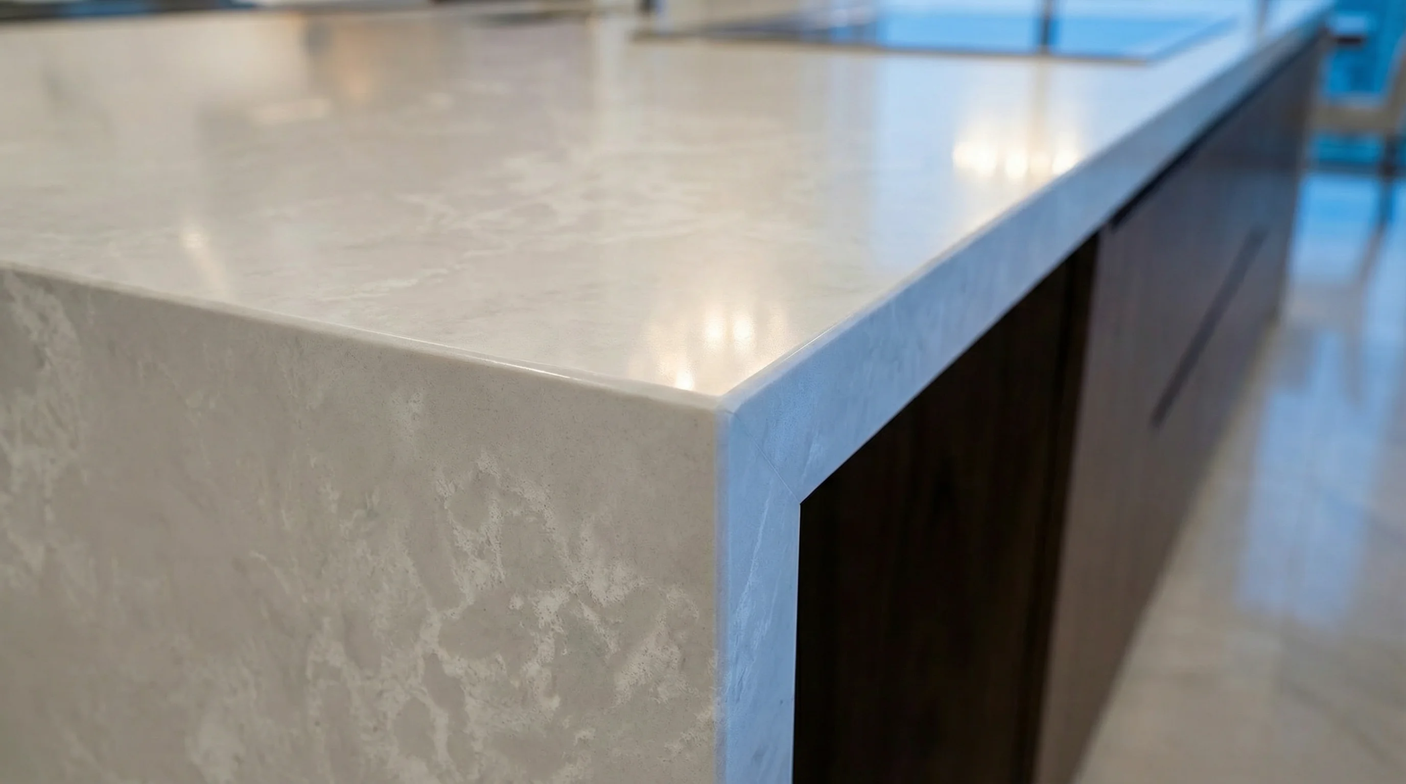 Эта столешница воплощает в себе спокойную роскошь и безупречный стиль, создавая центральный акцент в современном кухонном интерьере. Изысканный, светлый тон материала, украшенный едва уловимым, мраморовидным рисунком, напоминает нежные отблески жемчуга. Элегантный дизайн поверхности придает пространству ощущение простора и чистоты, подчеркивая безупречный вкус владельца и гармонично дополняя как классические, так и ультрасовременные решения.