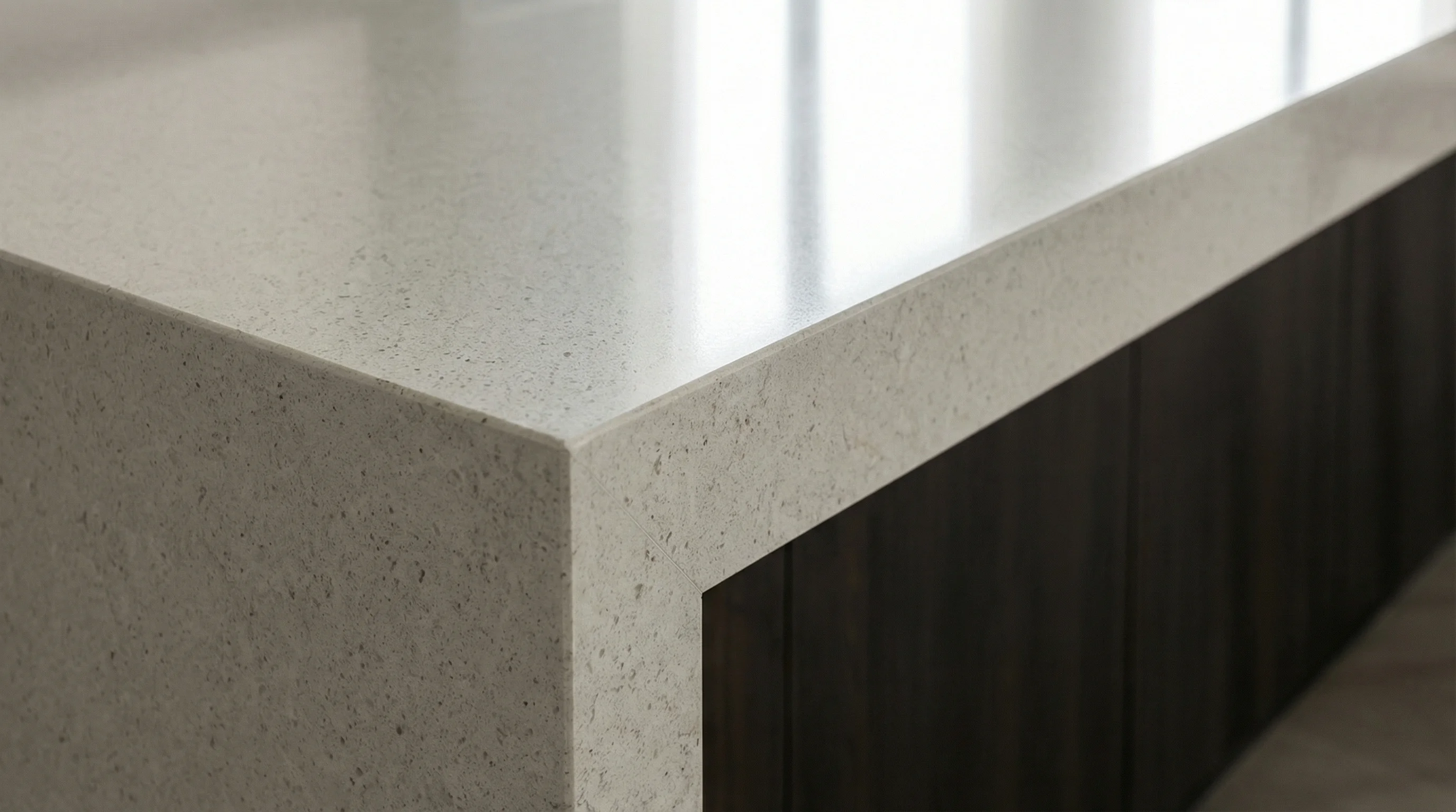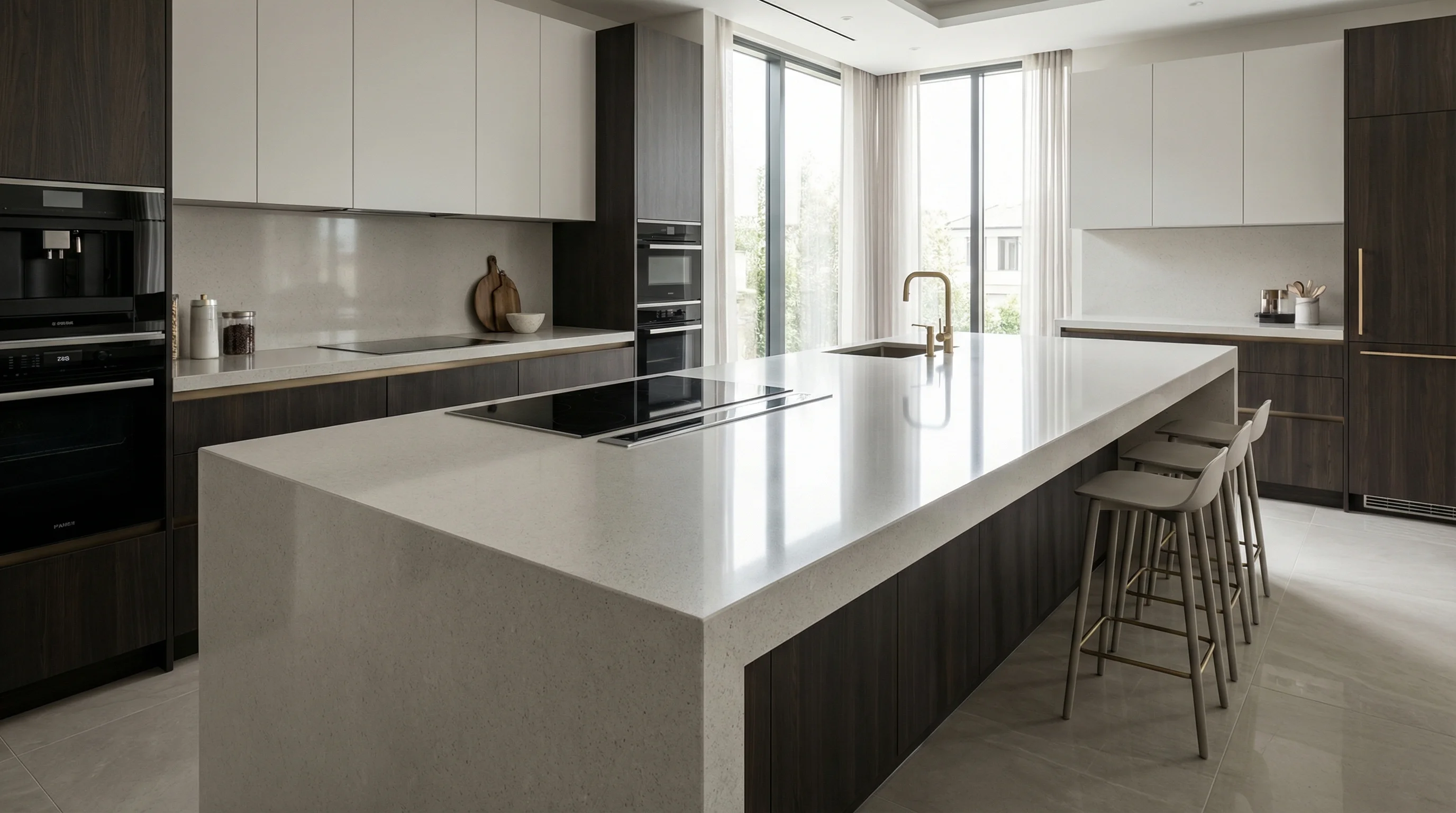 Поверхность этого изделия воплощает в себе эстетику сдержанной роскоши. Светлый, почти невесомый оттенок с едва уловимыми вкраплениями создает ощущение глубины и абсолютной чистоты. Текстура материала мягко рассеивает свет, наполняя пространство кухни благородным сиянием и визуальным спокойствием, характерным для интерьеров высокого класса.