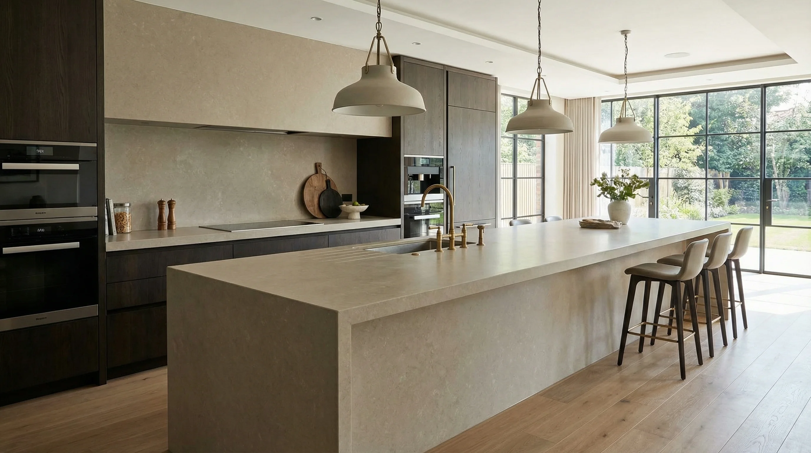 Эстетика этого решения строится на тонкой игре оттенков и глубокой текстуре, напоминающей мягкое мерцание океанического жемчуга. Благородный серый тон обладает уникальной способностью адаптироваться к освещению, наполняя интерьер едва уловимым сиянием и визуальной легкостью. Безупречно ровная поверхность подчеркивает монументальность исполнения, превращая функциональный элемент в центральный объект притяжения.