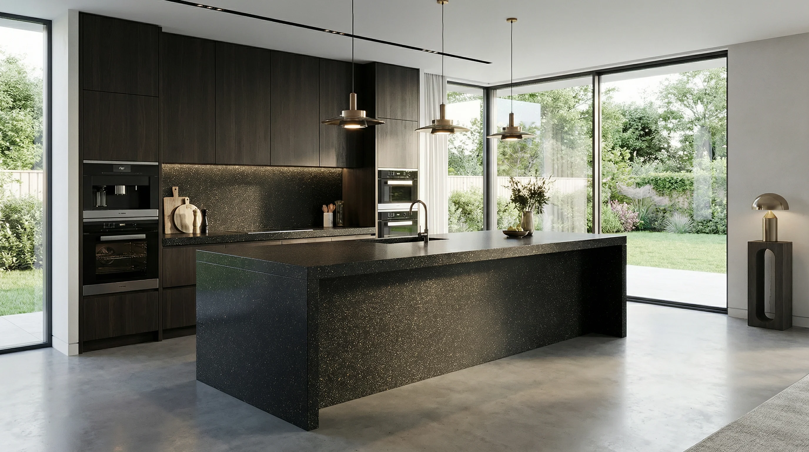 Поверхность притягивает взгляд своей гипнотической глубиной и деликатным мерцанием. Насыщенный темный фон служит идеальным холстом для мельчайших золотистых вкраплений, которые напоминают далекие созвездия в ночном небе. Это решение для тех, кто ценит эстетику «тихой роскоши» и стремится наполнить интерьер монументальностью, сохраняя при этом изящество каждой линии.