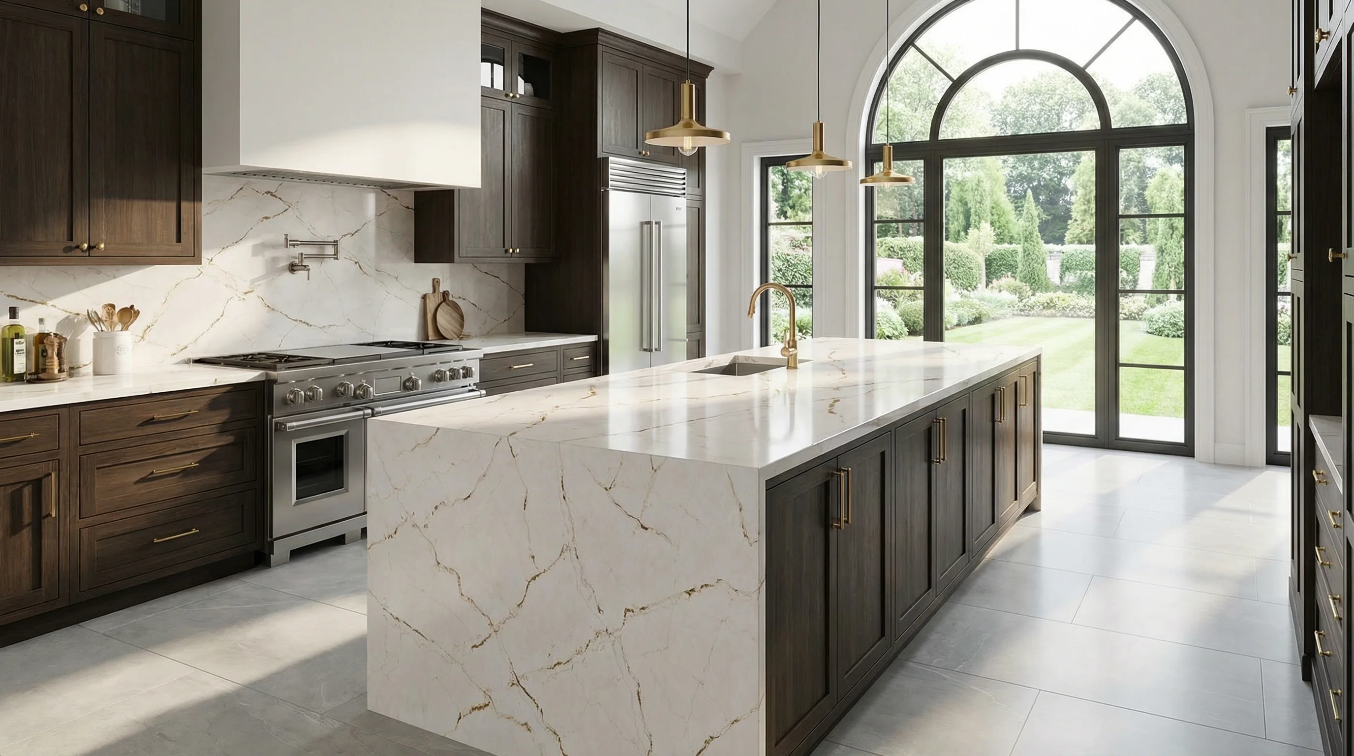 Представьте себе изысканный центр вашей кухни, где кремово-белая поверхность камня переплетается с роскошными золотистыми и бронзовыми венами, создавая уникальный, неповторимый рисунок. Этот камень не просто материал, а произведение искусства, добавляющее вашему интерьеру нотку утонченного великолепия и теплого свечения. Его природная красота мгновенно преображает пространство, становясь его доминантой.