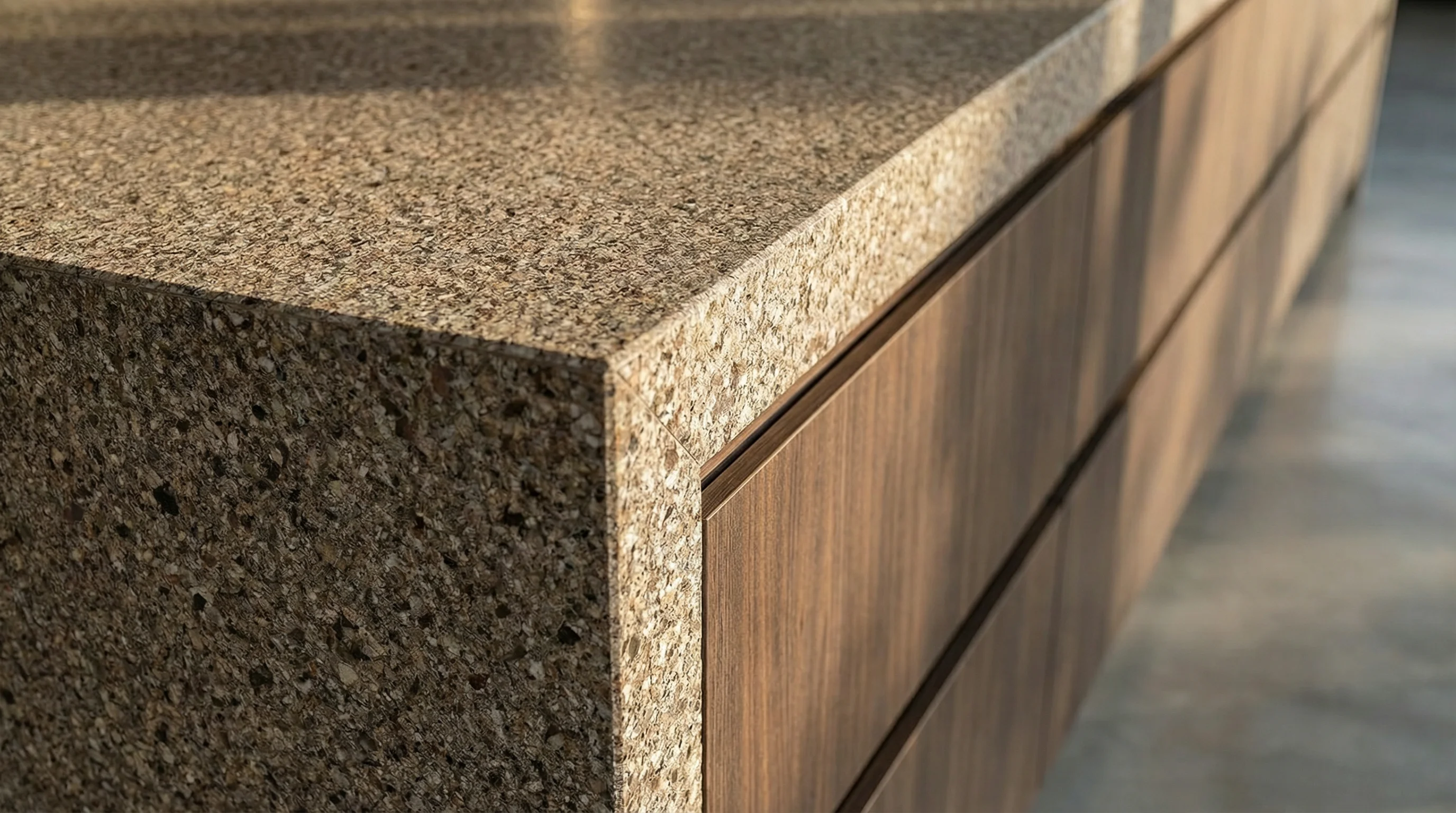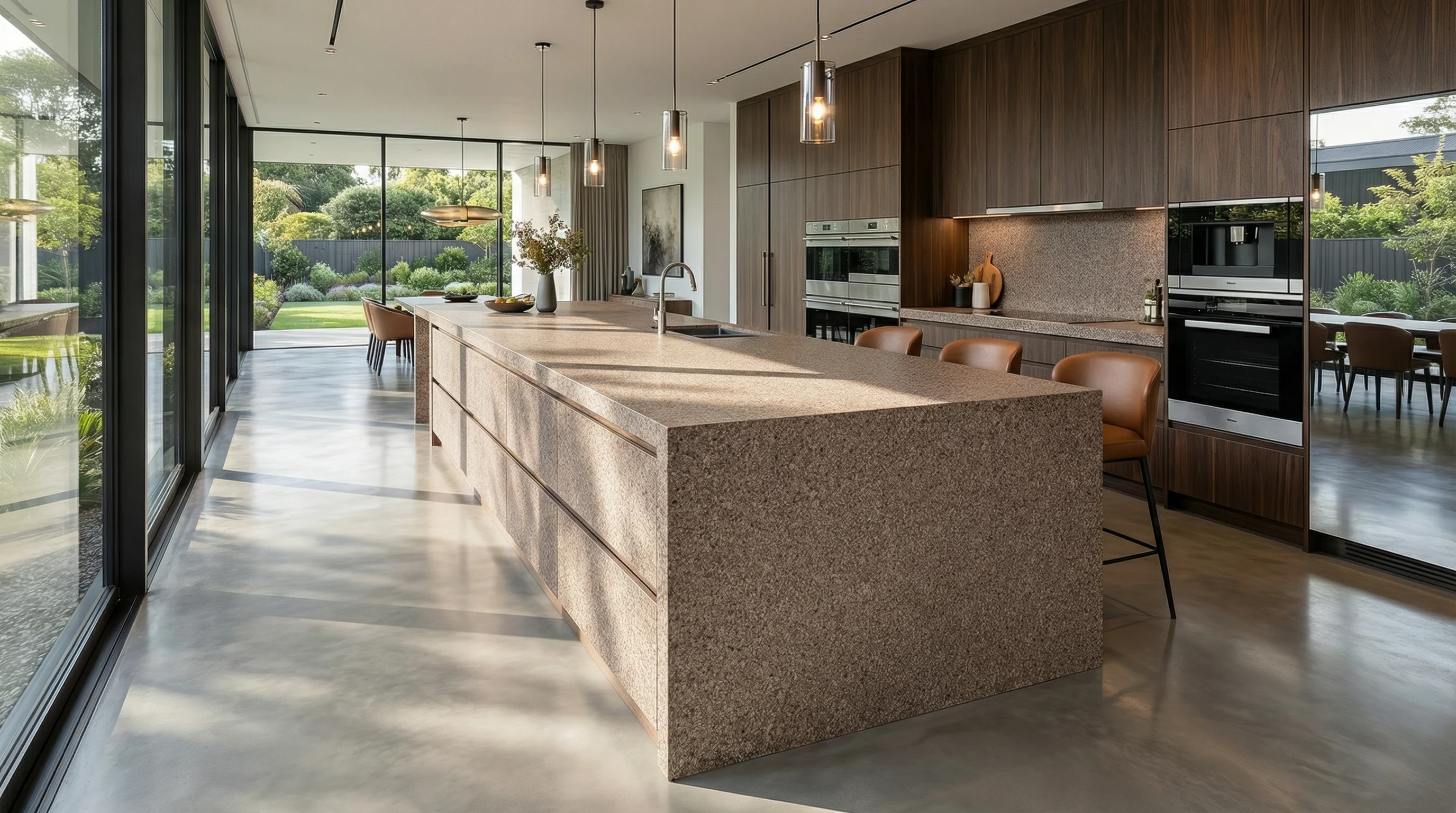 Эта поверхность воплощает в себе эстетику бескрайних пустынь, запечатленную в благородной и монолитной форме. Тонкозернистая текстура в сочетании с теплыми песочными оттенками создает неповторимую игру света, наполняя пространство ощущением спокойствия и природного равновесия. Тактильно приятная, но визуально основательная, она становится центральным архитектурным элементом современного интерьера.