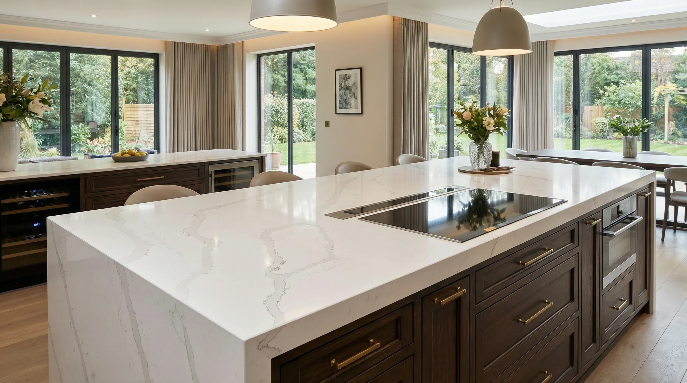Эта поверхность притягивает взгляд своей безупречной белизной и тонкими, словно нарисованными кистью мастера, золотистыми прожилками. Уникальный рисунок текстуры Calacatta Victory Gold передает благородство природного узора, наполняя пространство светом и ощущением безграничного простора. Каждый изгиб линий на полотне подчеркивает статус интерьера, превращая обыденную рабочую зону в центральный элемент эстетического притяжения.