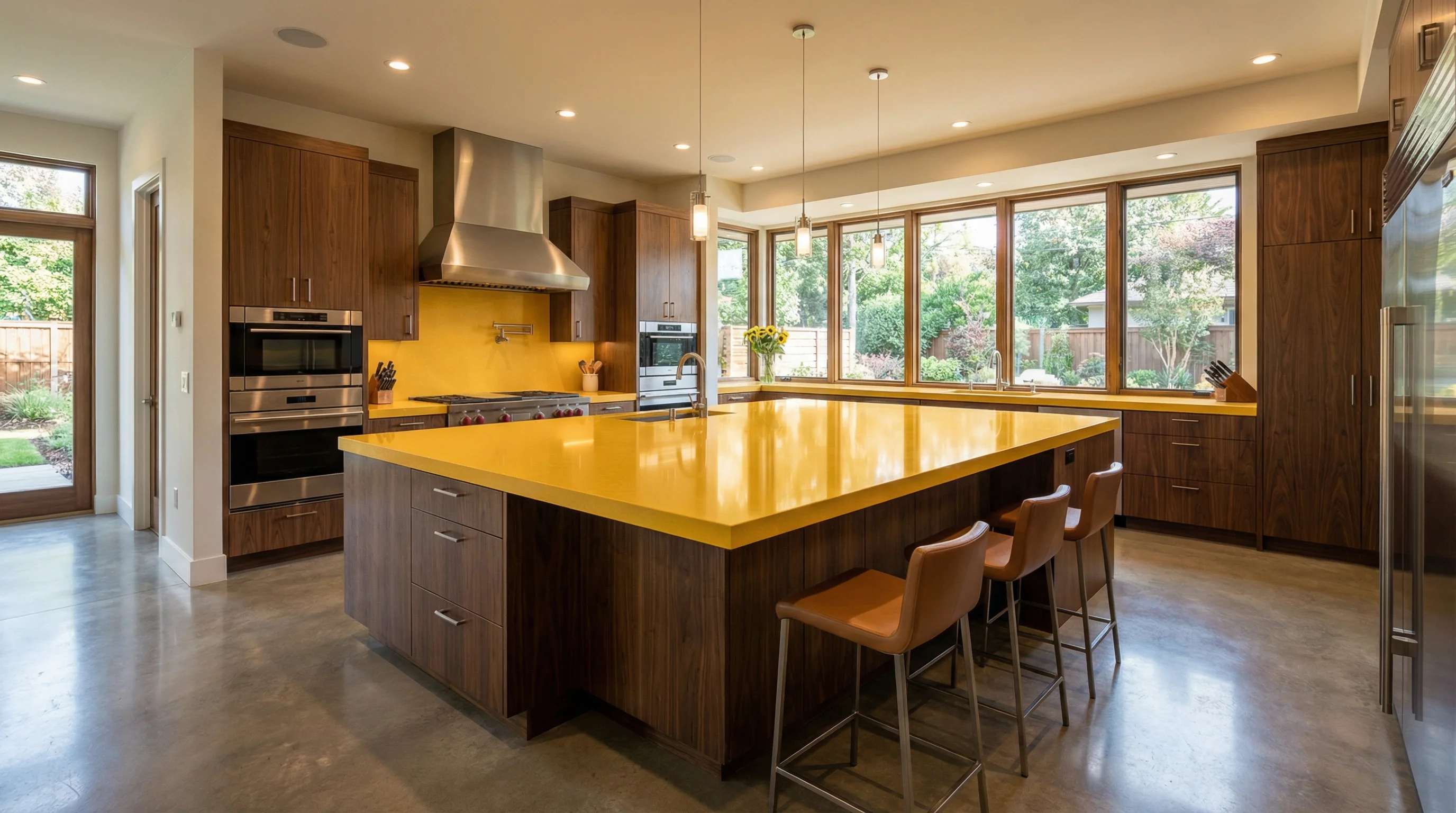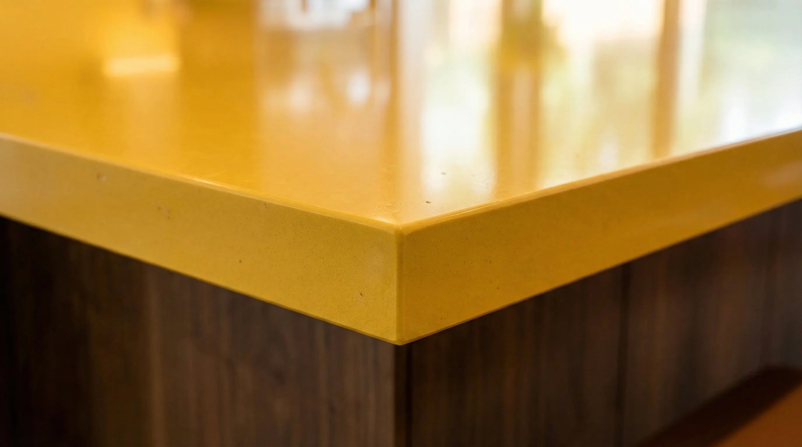 Изделие представляет собой смелое воплощение солнечной энергии и архитектурной чистоты. Глубокий, насыщенный цвет наполняет пространство жизнью, превращая интерьер в настоящий оазис тепла и света. Безупречно гладкая поверхность с мягким глянцевым финишем создает выразительную игру бликов, которая визуально расширяет помещение и эффектно подчеркивает благородную текстуру фасадов из натурального дерева.