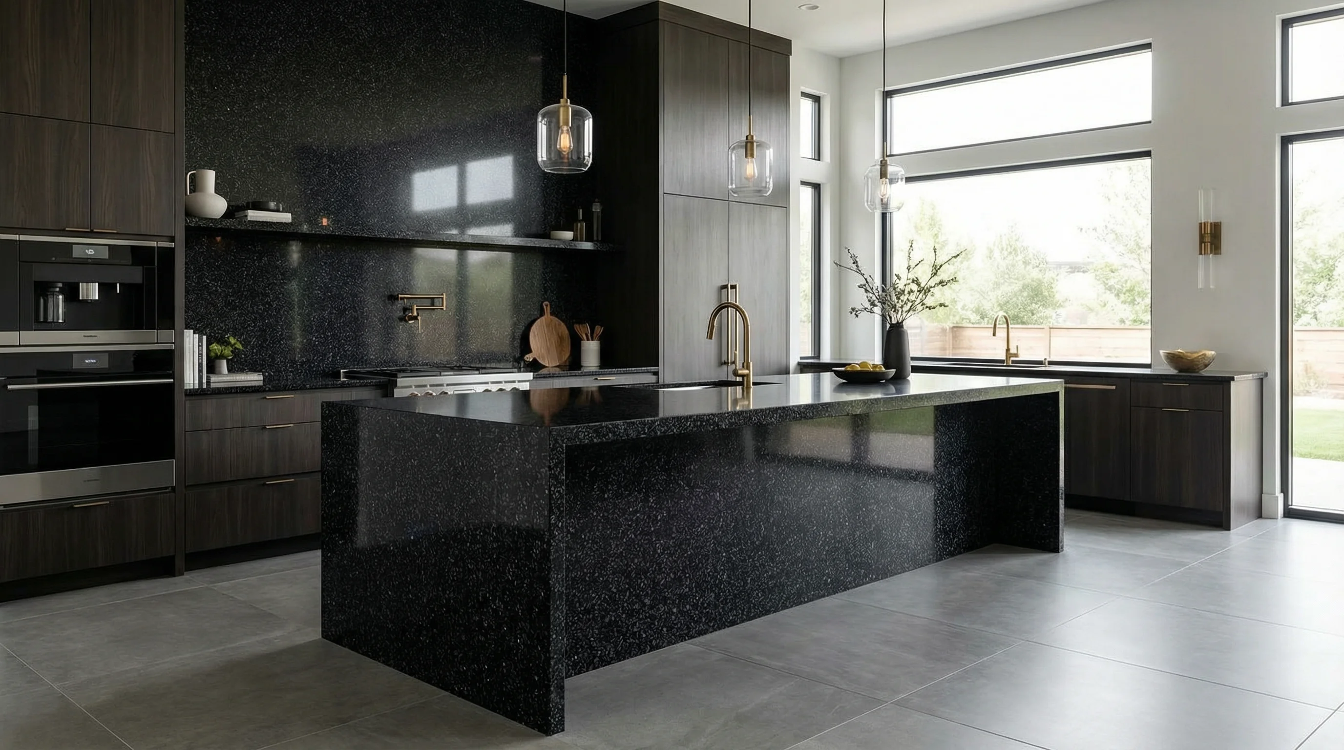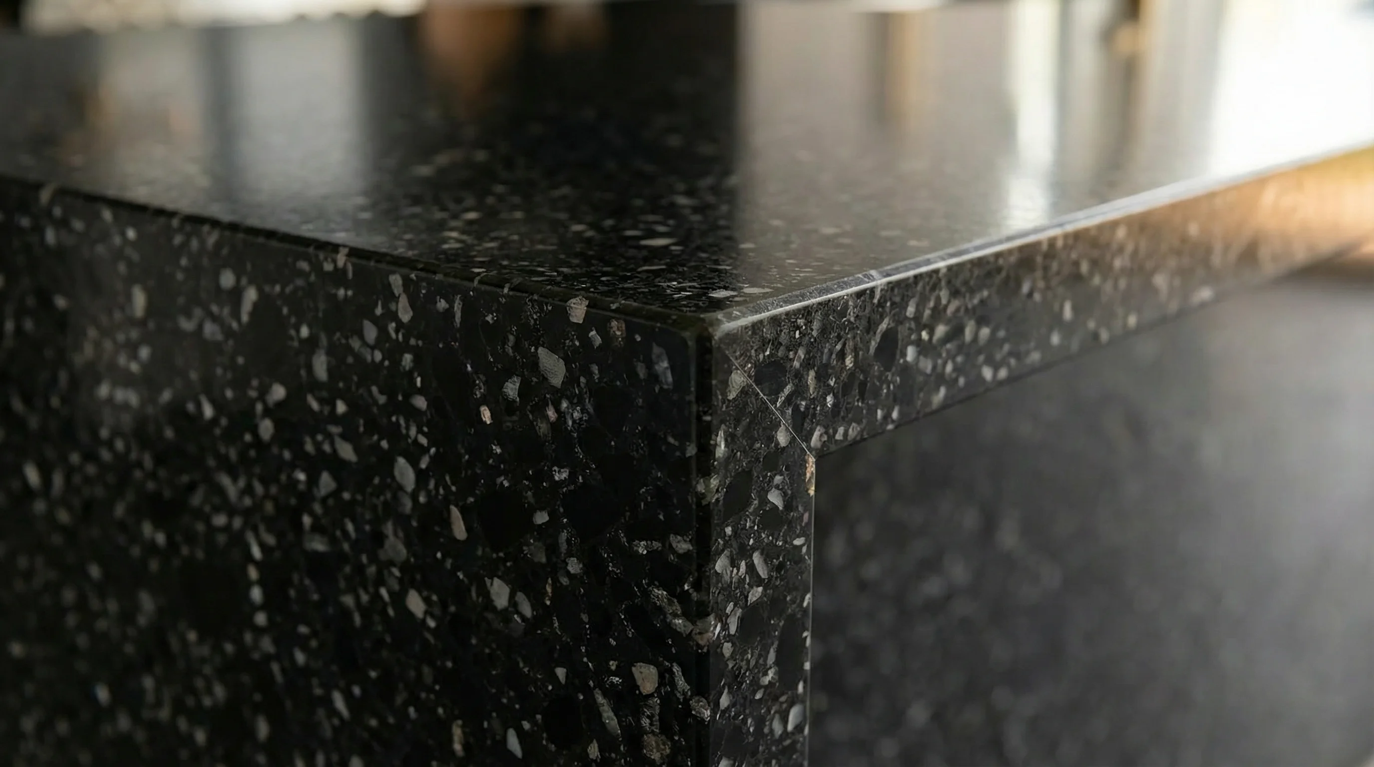 Глубокий, насыщенный оттенок этой поверхности напоминает бесконечное ночное небо, усыпанное мириадами далеких созвездий. Мелкие кристаллические включения создают завораживающую игру света, которая оживает при каждом движении, превращая привычное пространство в объект высокого искусства. Идеально отполированная текстура дарит ощущение безупречной гладкости и подчеркивает монументальность интерьера, наполняя его атмосферой спокойствия и благородства.